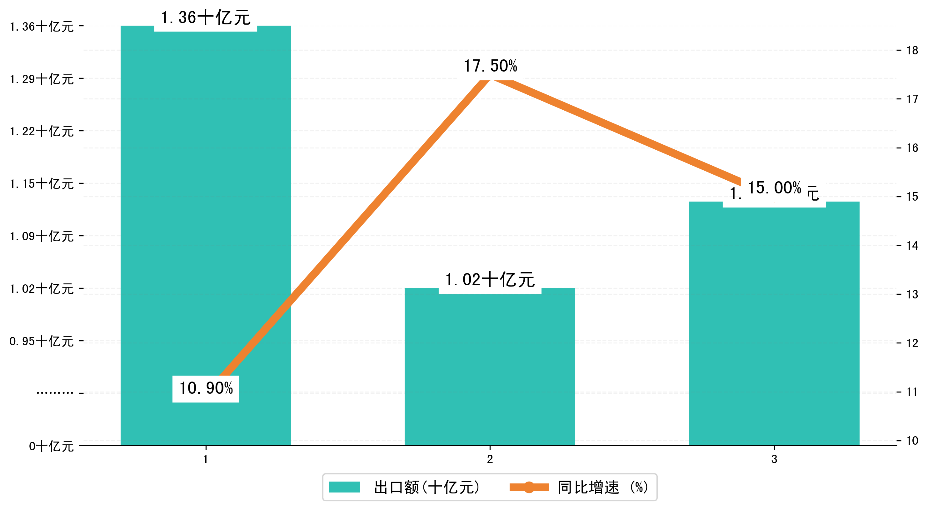 以人民币计,2023年3月丹东市出口额为11,3084.4591万元,相比上月增加了1,1090.6741万元;相比上年同期增加了1,0495.1192万元,同比增加了15.00%。