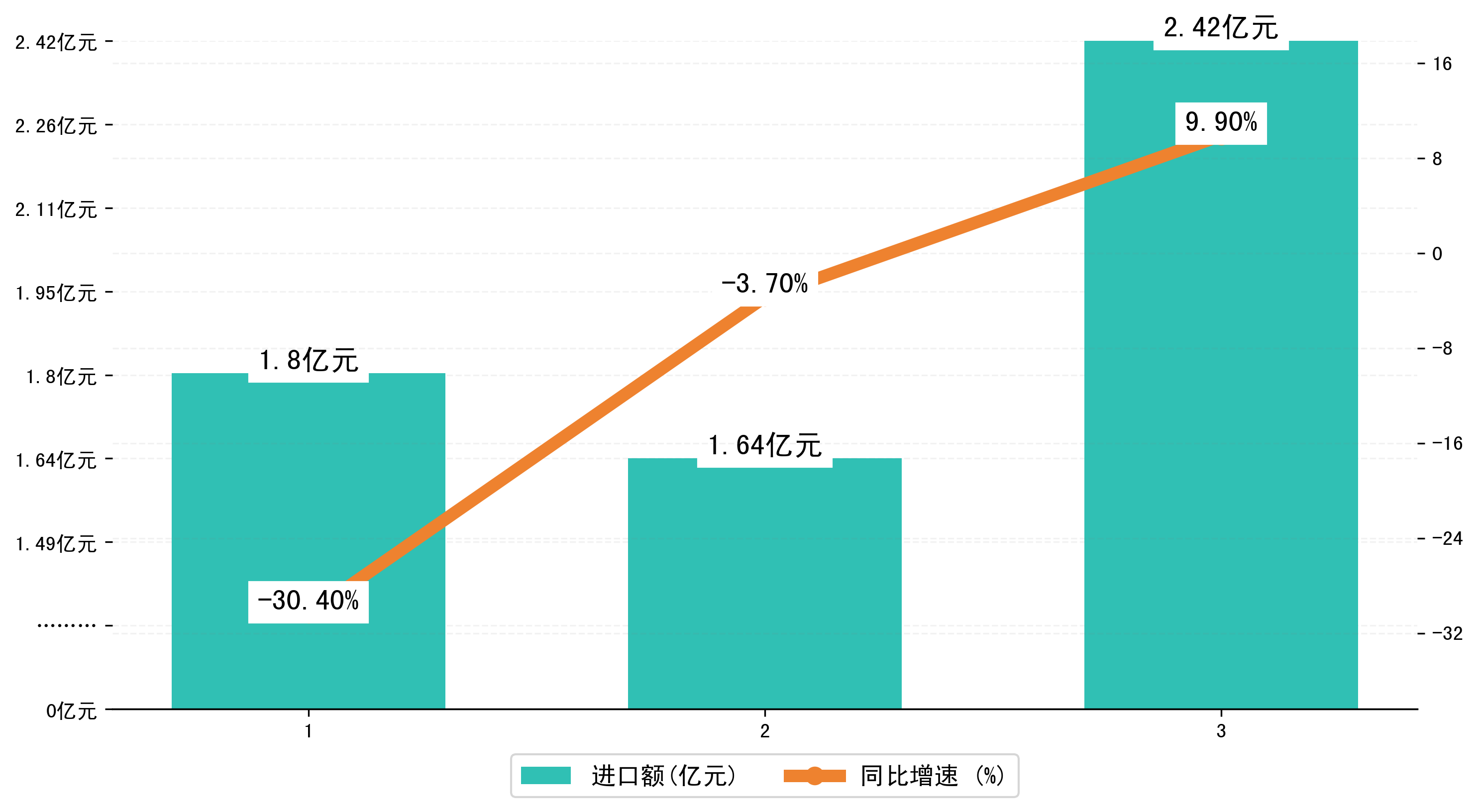以人民币计,2023年1-3月丹东市进口额为5,8591.9998万元,相比上年同期增加了5302.0926万元,同比增加了9.90%。