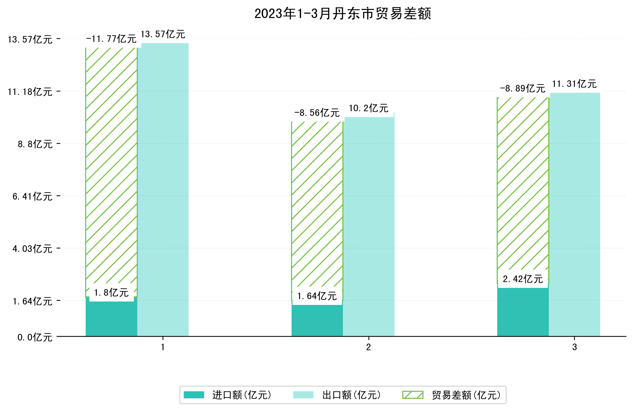 以美元计,2023年1-3月丹东市贸易差额为4,2515,4976万美元(贸易顺差),相比上年同期增加了2980,4763万美元,同比增加7.54%。