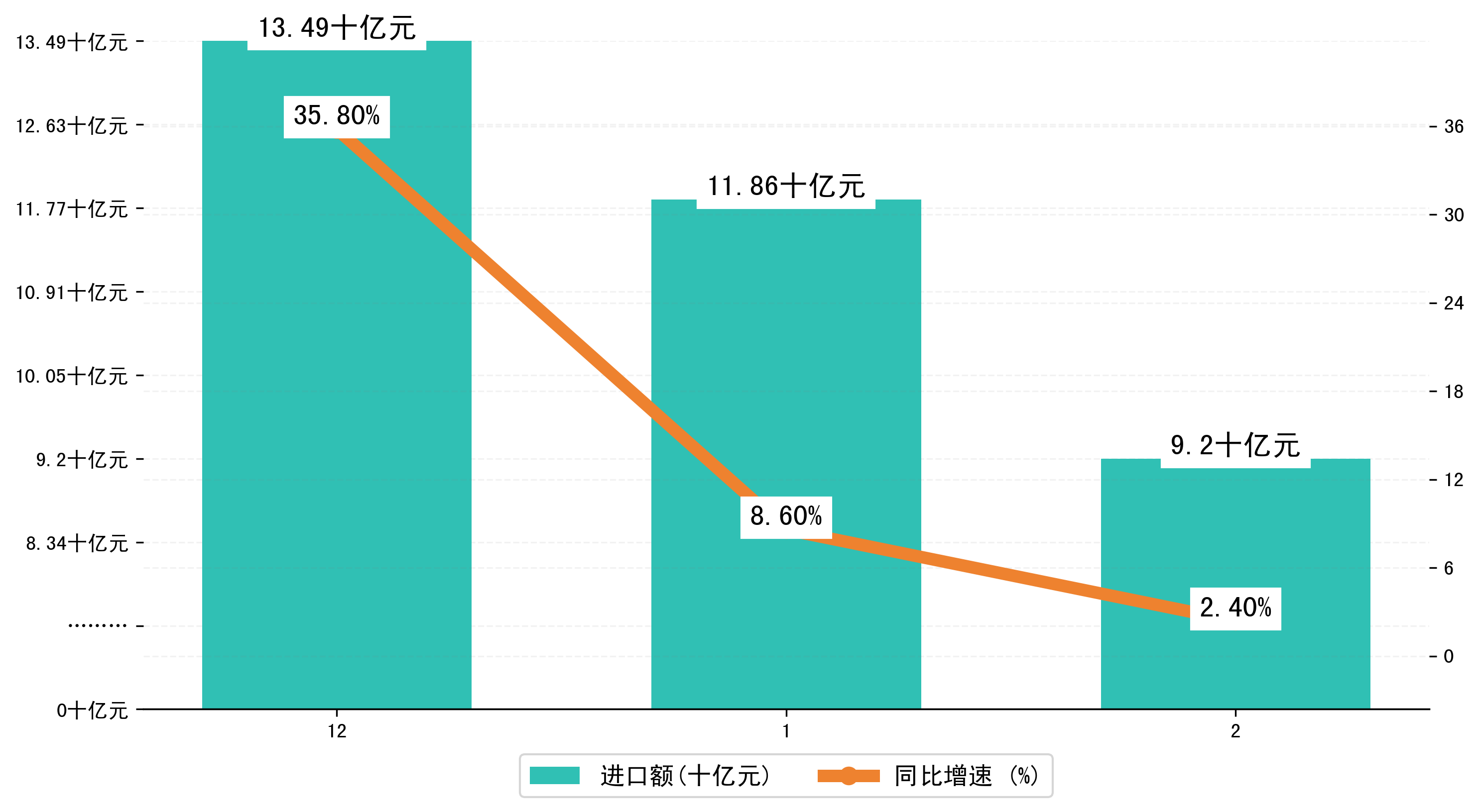 以人民币计,2023年1-2月大庆市进口额为210,5530.6207万元,相比上年同期增加了4,8584.8158万元,同比增加了2.40%。