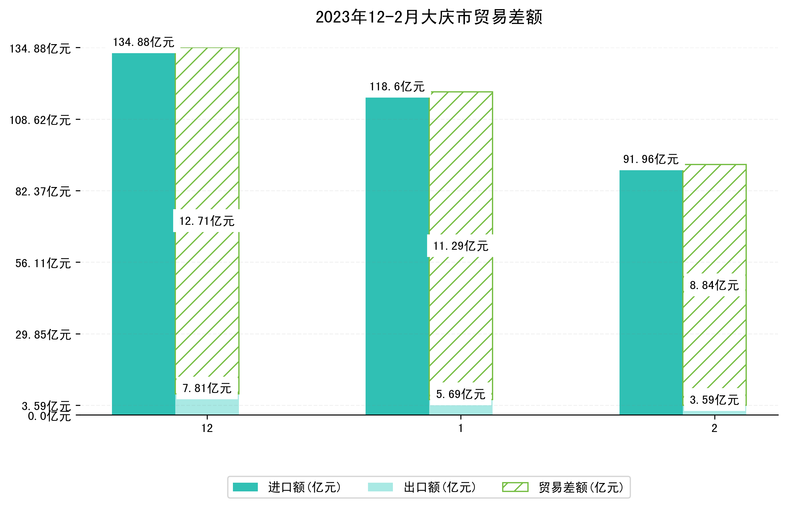 以人民币计,2023年1-2月大庆市贸易差额为201,2762,0898万元(贸易逆差),相比上年同期减少了6,4765,2347万元,同比减少3.32%。