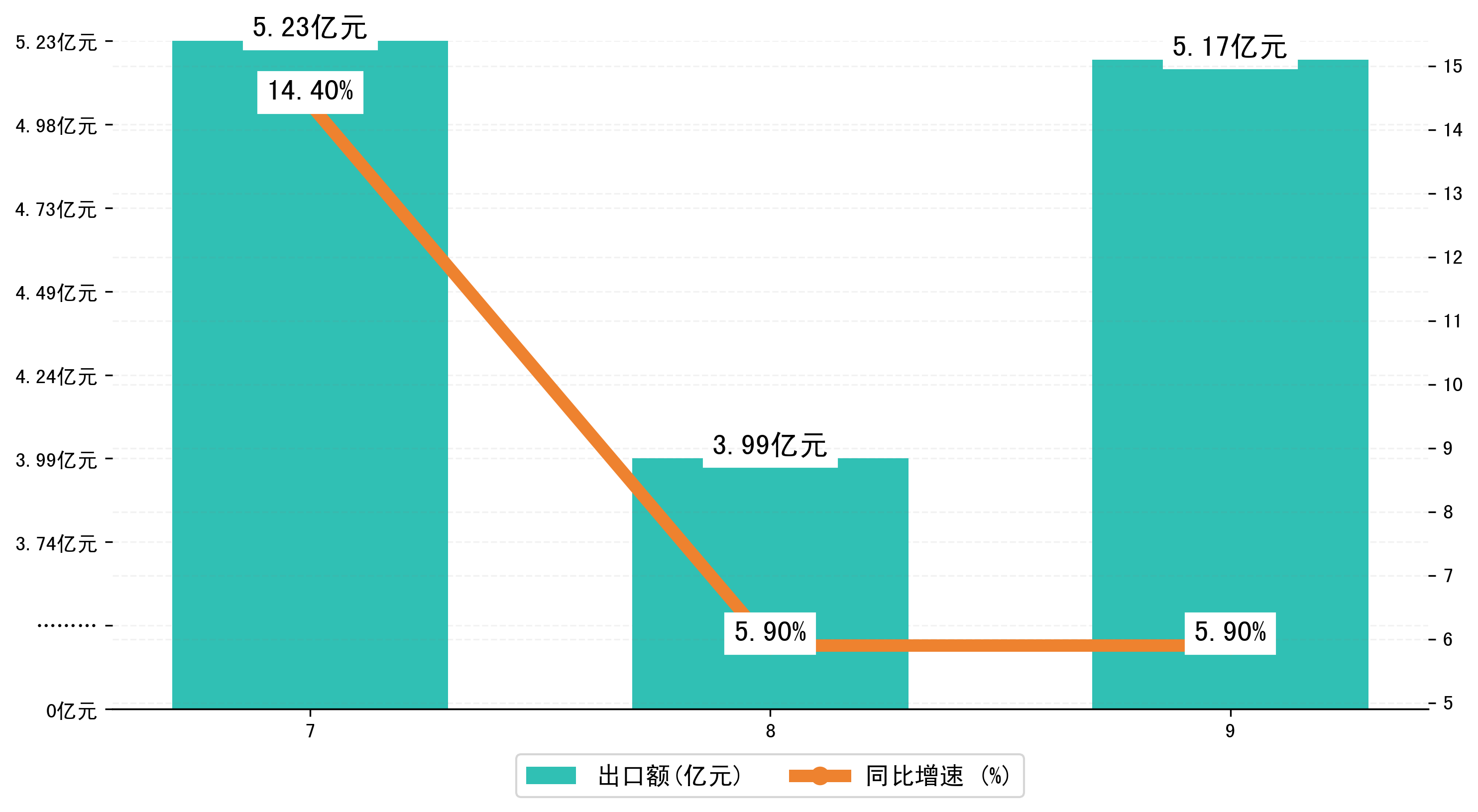 以人民币计,2023年9月大庆市出口额为5,1717.9067万元,相比上月增加了1,1812.759万元;相比上年同期增加了1353.4972万元,同比增加了5.90%。