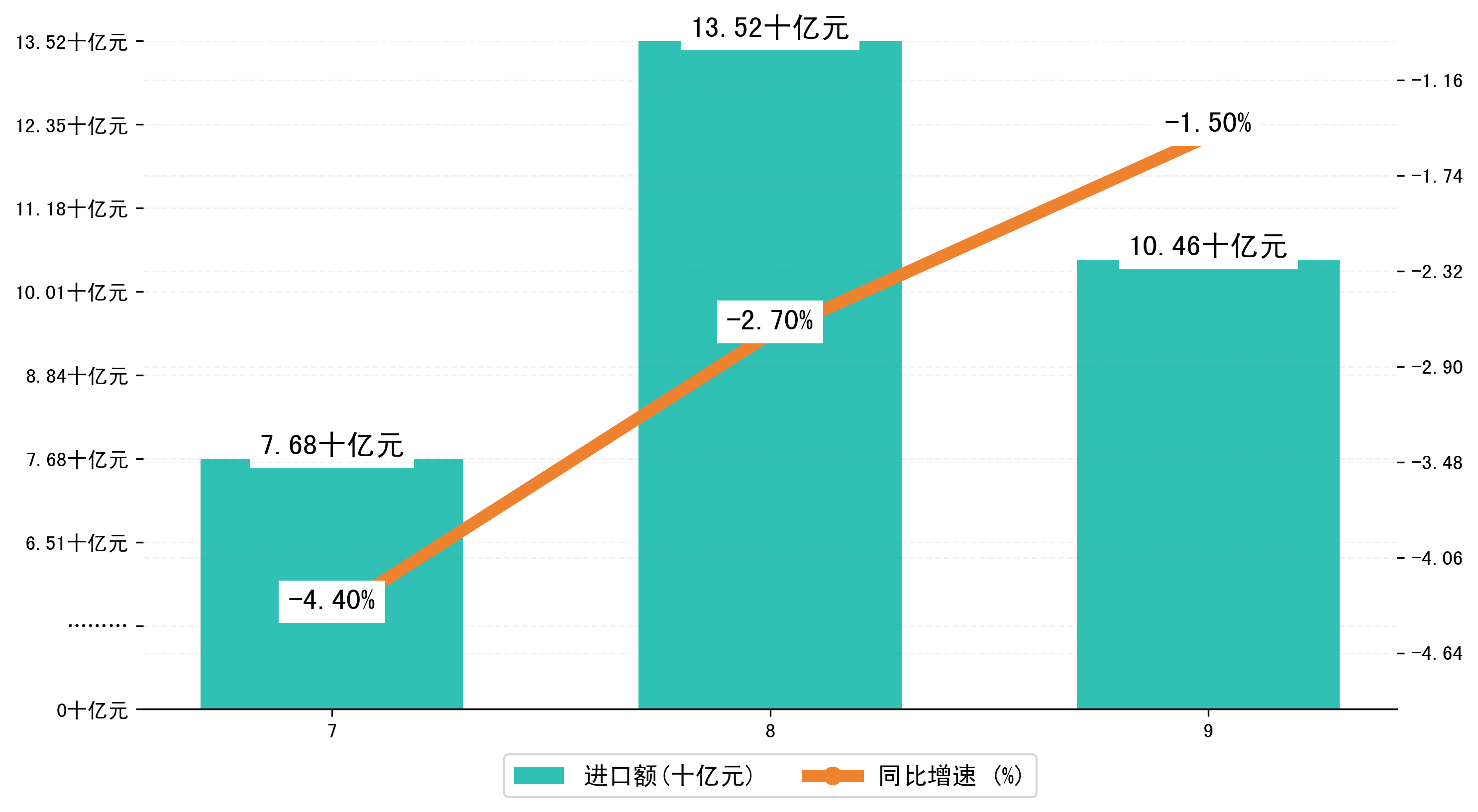 以人民币计,2023年1-9月大庆市进口额为967,3340.7862万元,相比上年同期减少了15,1295.3836万元,同比减少了-1.50%。