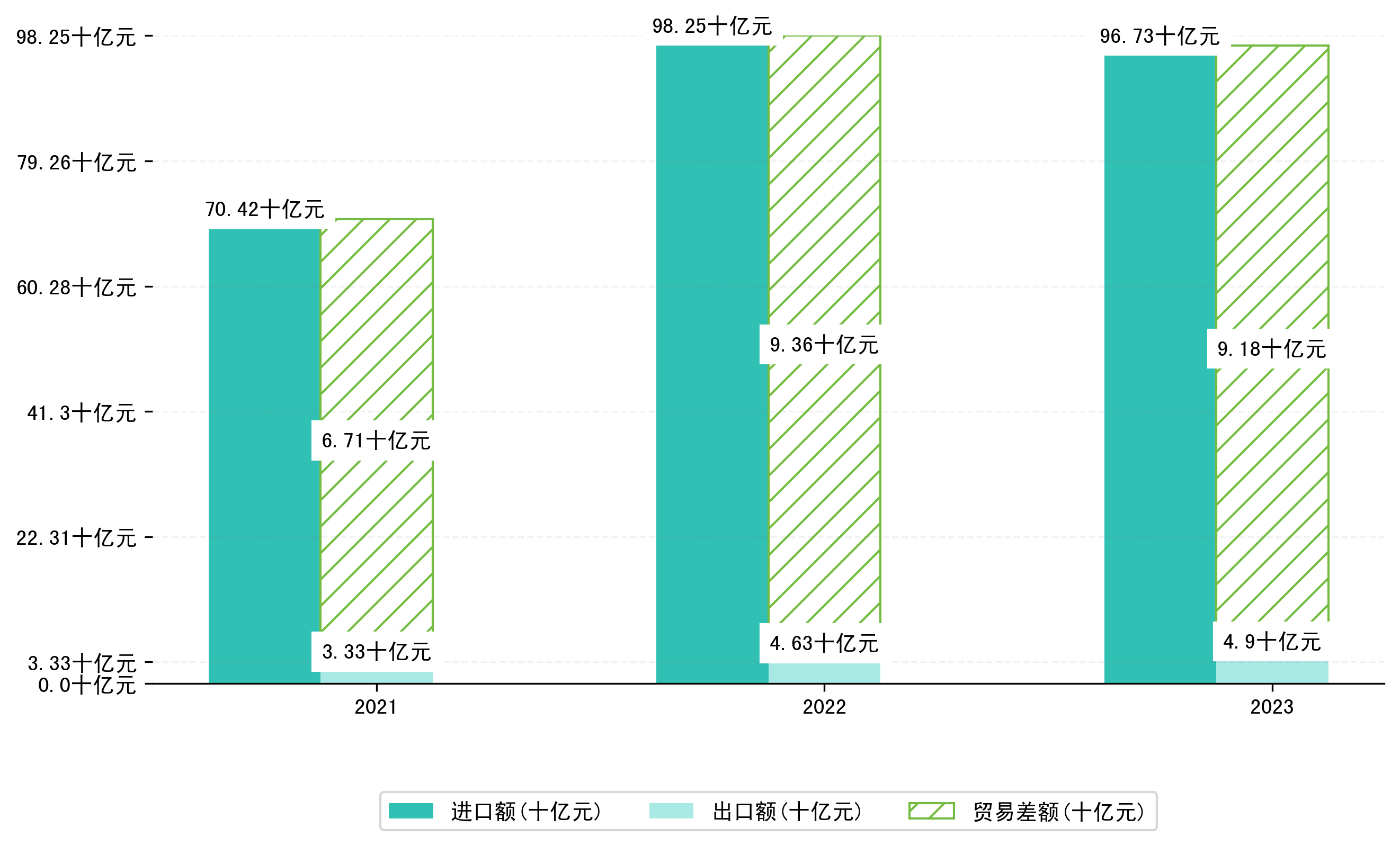 以人民币计,2023年1-9月大庆市贸易差额为918,3504,4827万元(贸易逆差),相比上年同期增加了17,8338,0266万元,同比增加-1.9%。