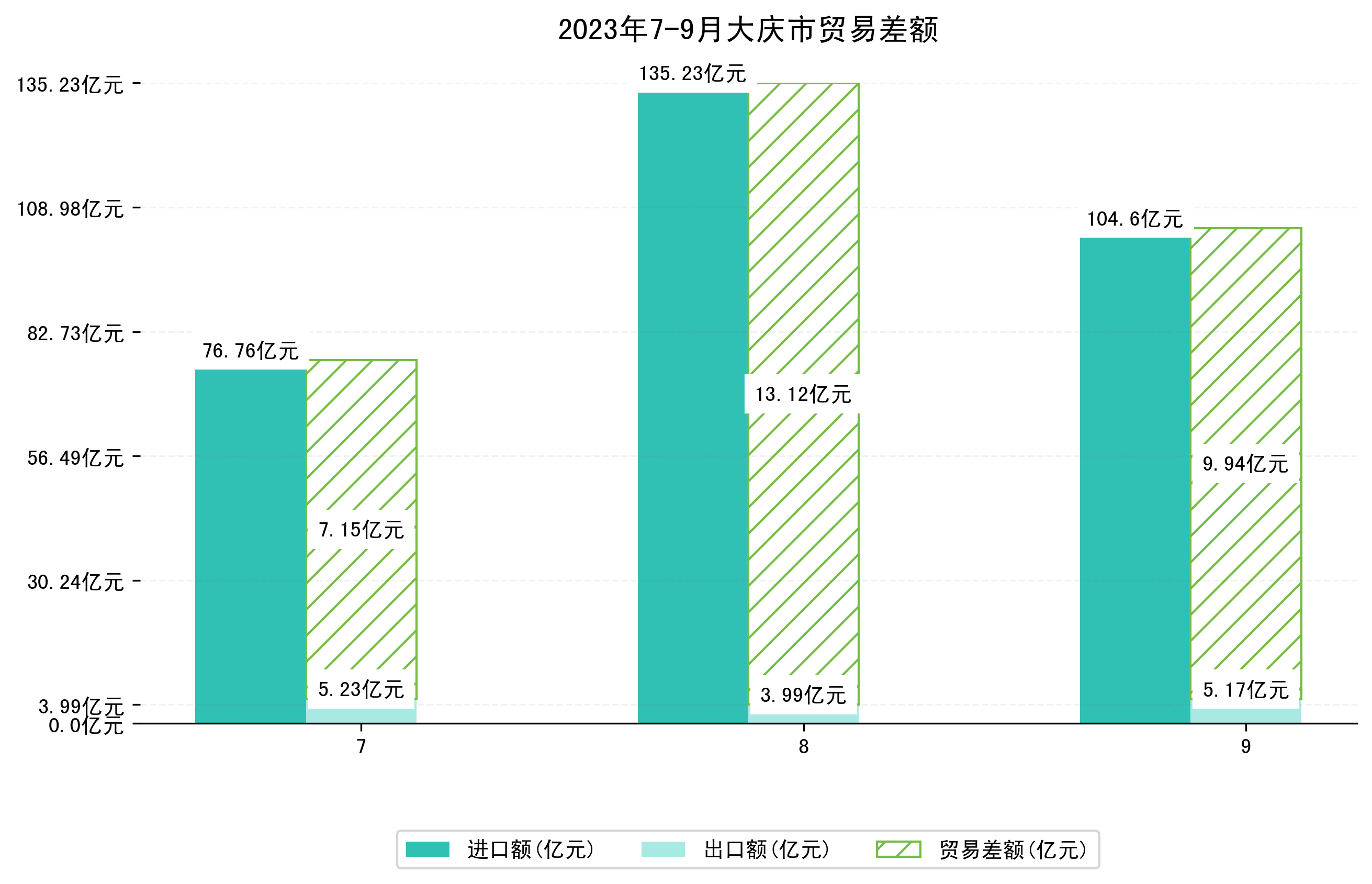 以人民币计,2023年9月大庆市贸易差额为99,4312,8121万元(贸易逆差),相比上月增加了31,8049,7282万元,即4,5439,2649万美元;相比上年同期减少了8,9695,5937万元,同比减少9.92%。