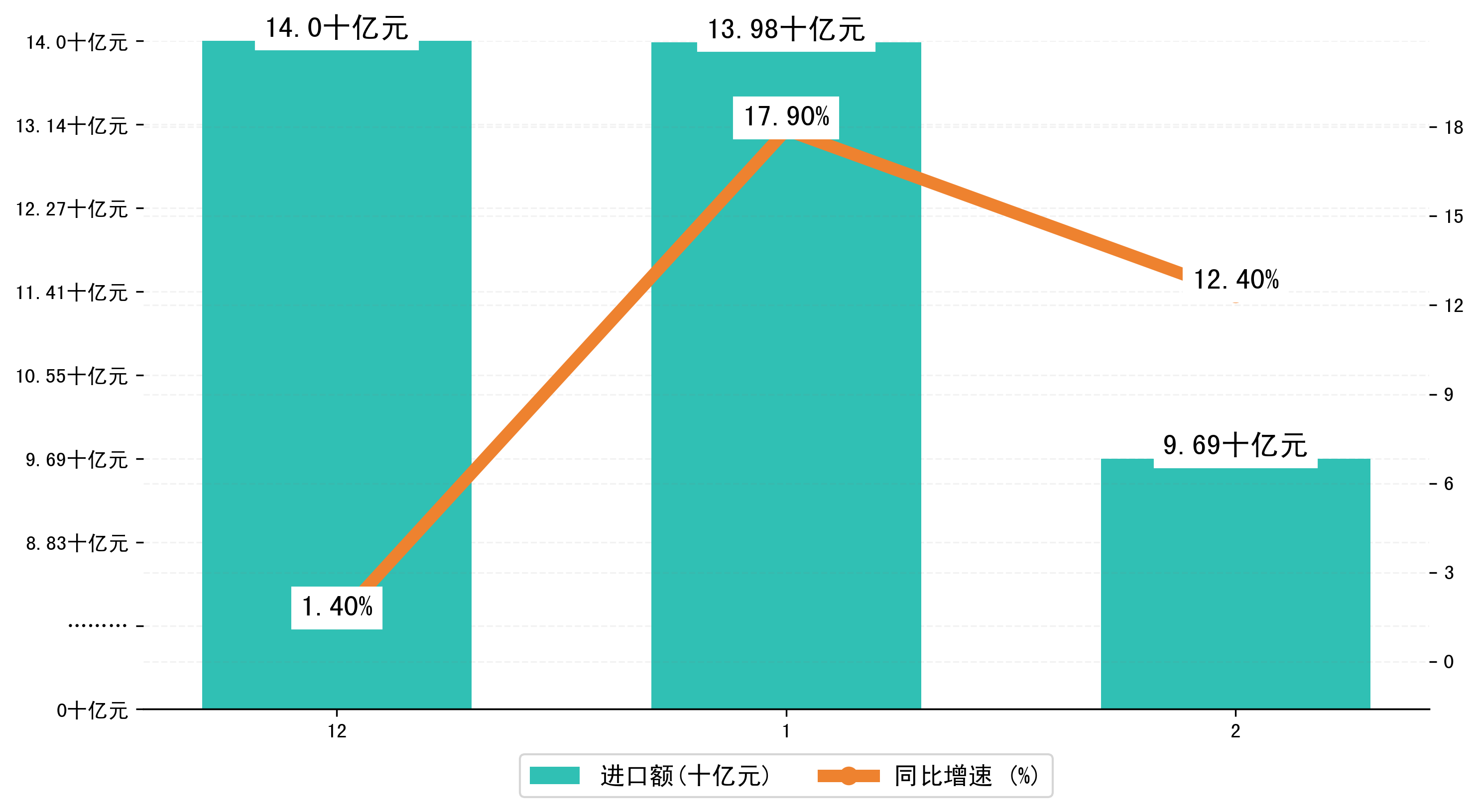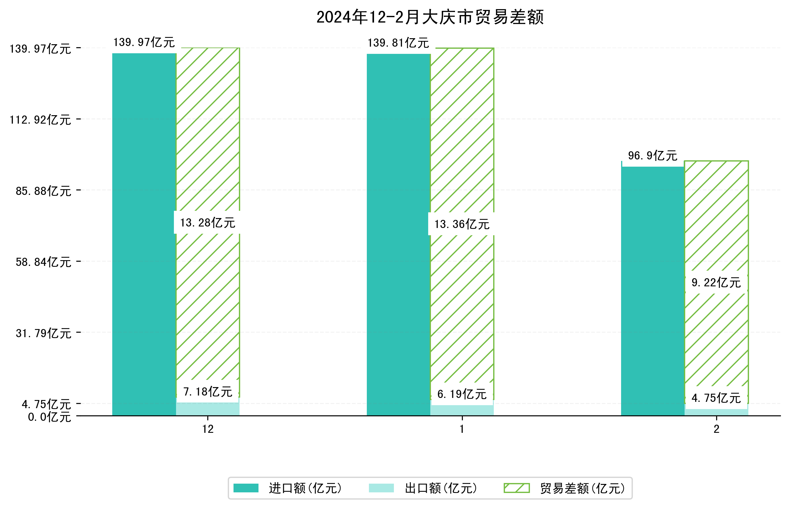 以美元计,2024年2月大庆市贸易差额为12,9469,5088万美元(贸易逆差),相比上月增加了5,8871,4147万美元;相比上年同期减少了1259,1712万美元,同比减少-0.96%。