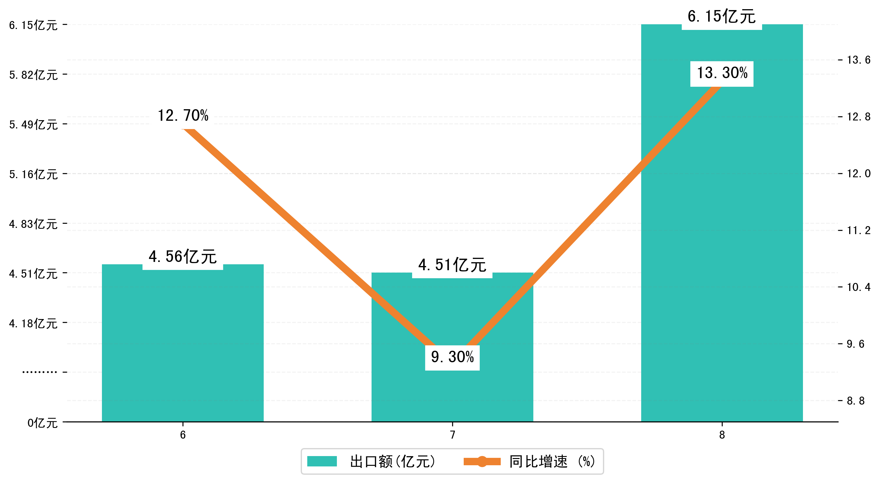 以人民币计,2024年8月大庆市出口额为6,1510.3287万元,相比上月增加了1,6455.1192万元;相比上年同期增加了2,1605.181万元,同比增加了13.30%。