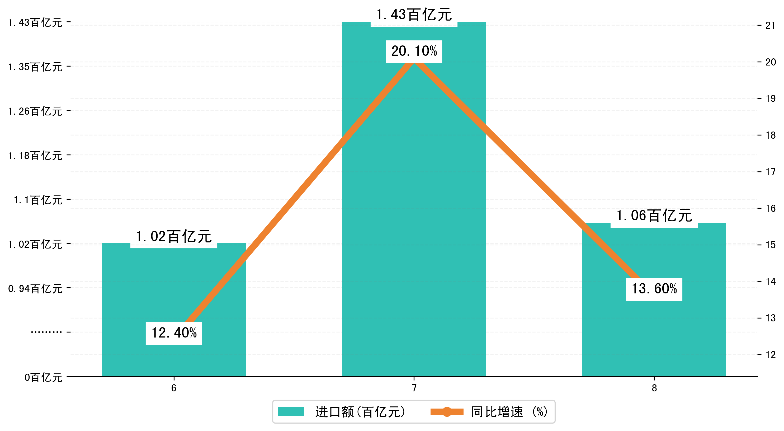 以人民币计,2024年1-8月大庆市进口额为979,9643.6006万元,相比上年同期增加了117,2333.5333万元,同比增加了13.60%。