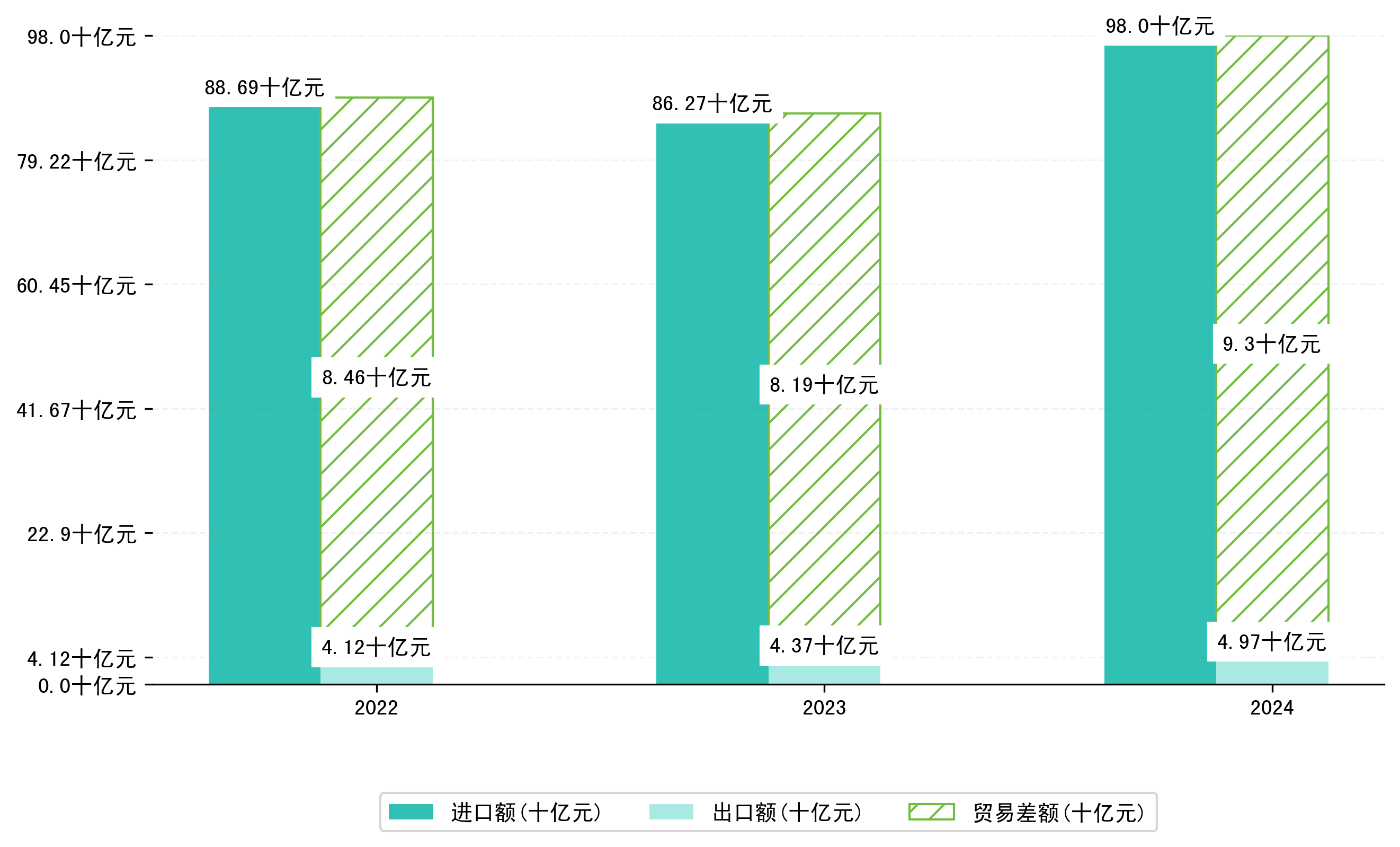 以人民币计,2024年8月大庆市贸易差额为99,7647,1219万元(贸易逆差),相比上月增加了38,4697,0159万元,即5,4365,9665万美元;相比上年同期增加了31,4715,4184万元,同比增加-23.98%。