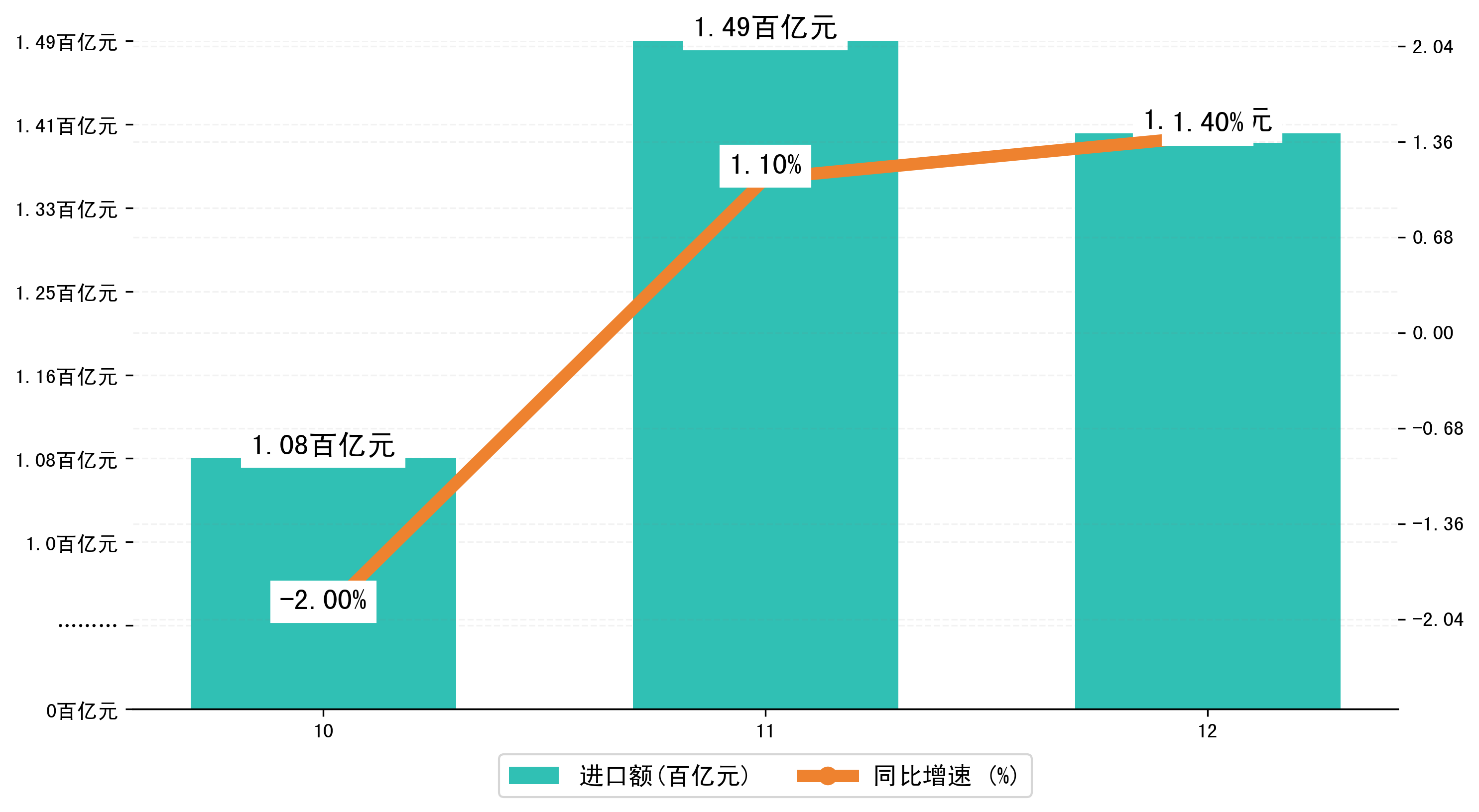 以人民币计,2023年12月大庆市进口额为139,9676.266万元,相比上月减少了9,0173.728万元;相比上年同期增加了5,0844.8778万元,同比增加了1.40%。