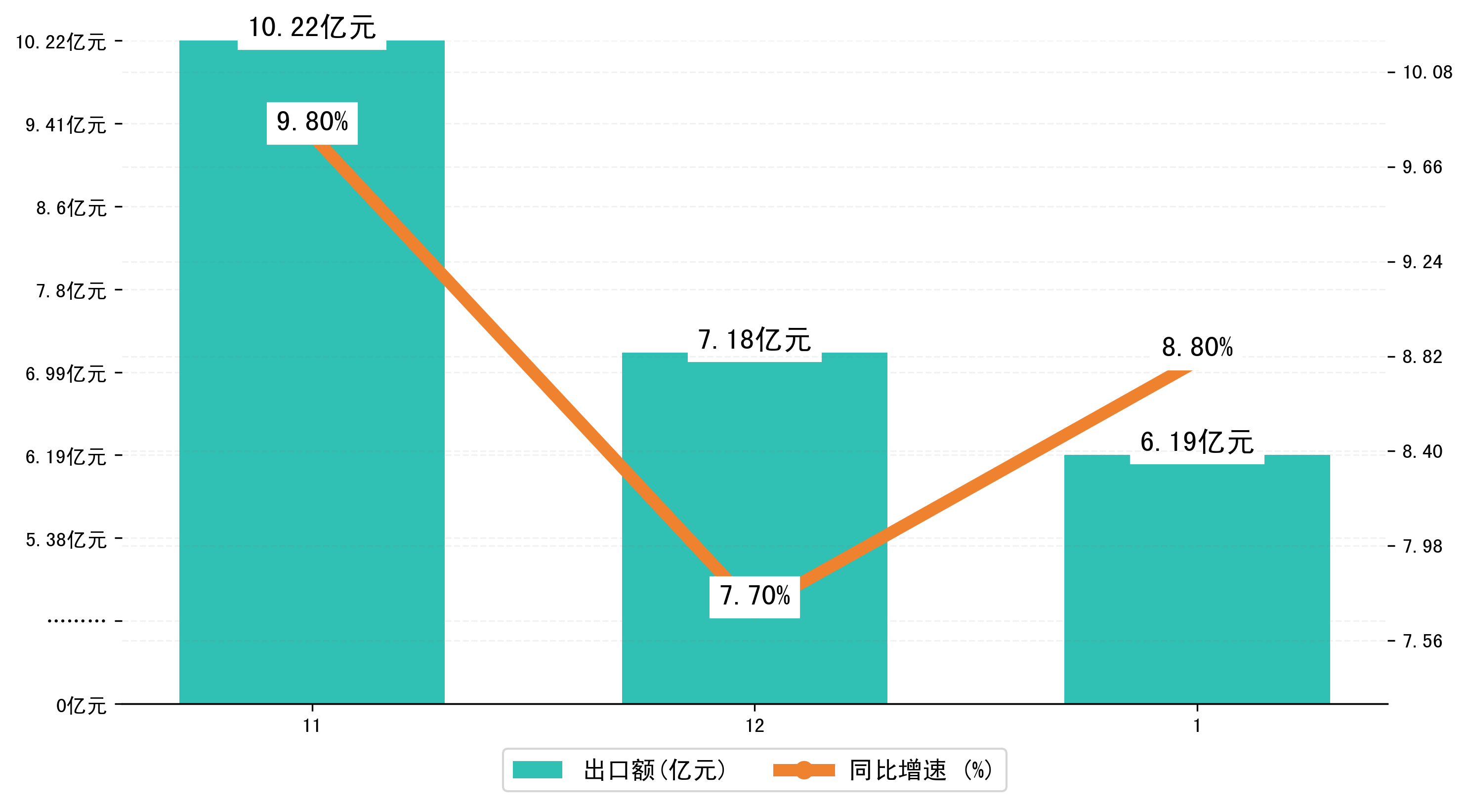 以美元计,2024年1-1月大庆市出口额为8701.868万美元,相比上年同期增加了592.1932万美元,同比增加7.30%。