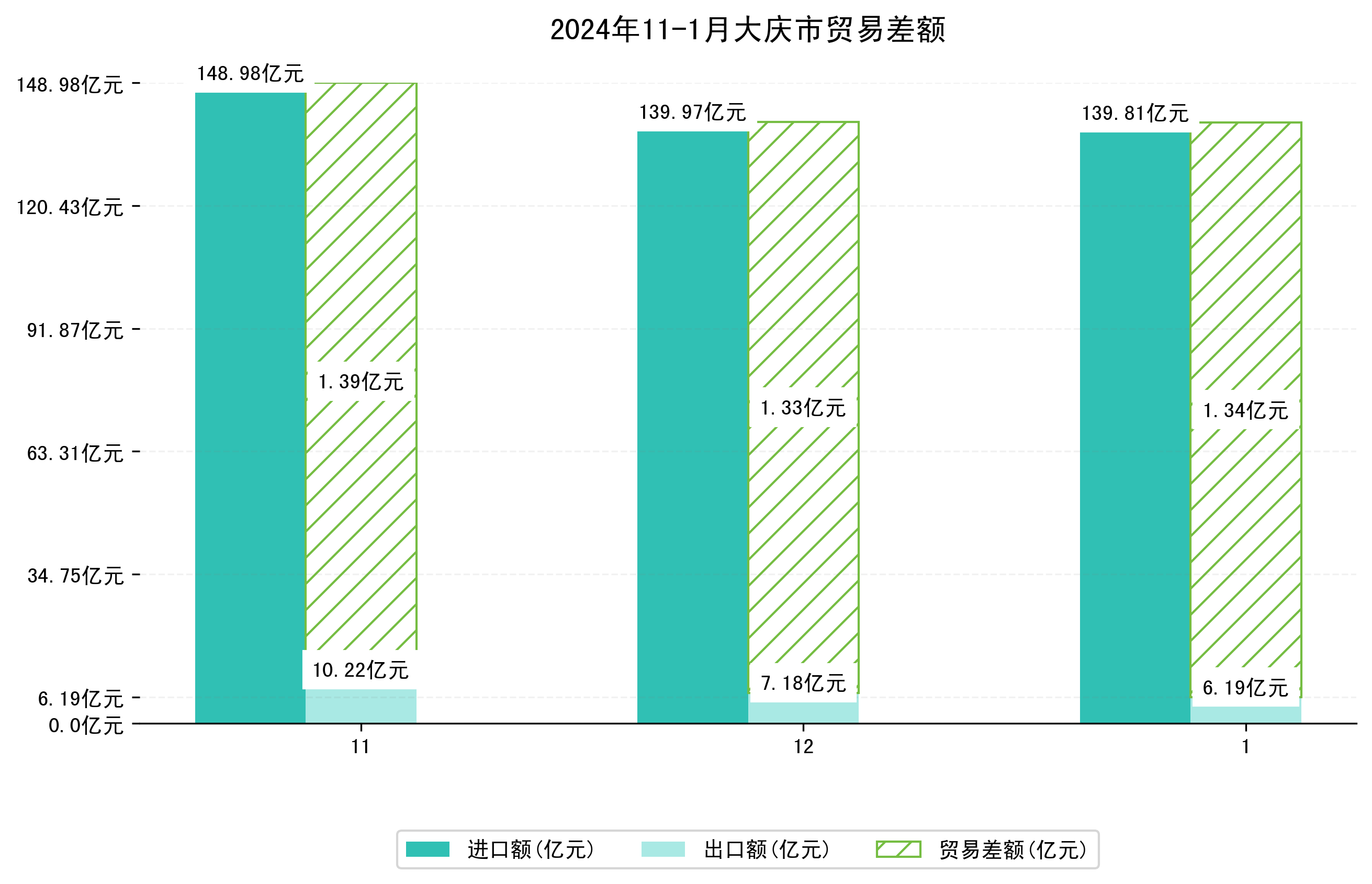 以人民币计,2024年1-1月大庆市贸易差额为133,6289,9748万元(贸易逆差),相比上年同期减少了20,7194,5585万元,同比减少18.35%。