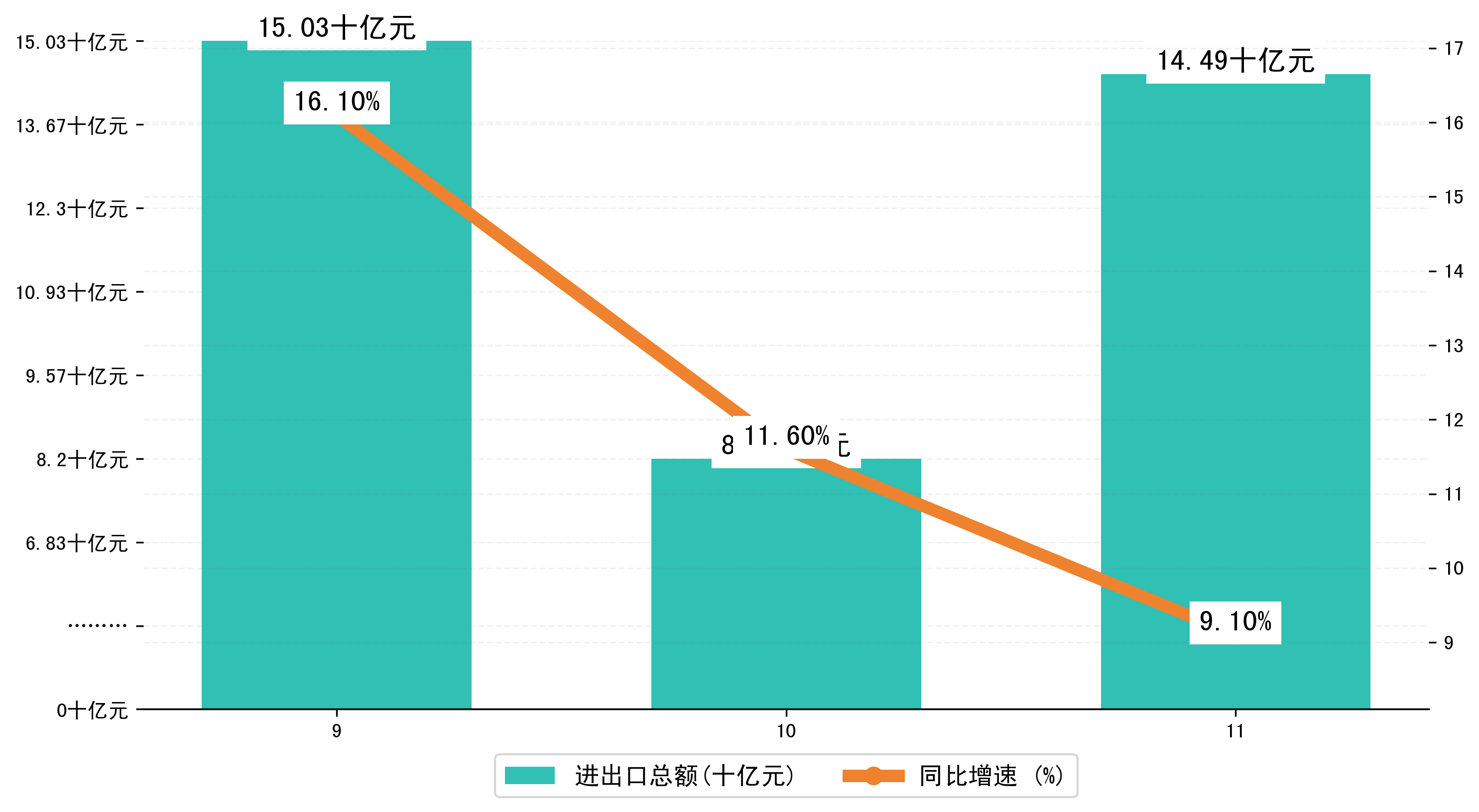 以人民币计,2024年11月大庆市进出口总额为144,9090.876万元,相比上月增加了62,8974.5627万元;相比上年同期减少了14,2915.1628万元,同比增加了9.10%。