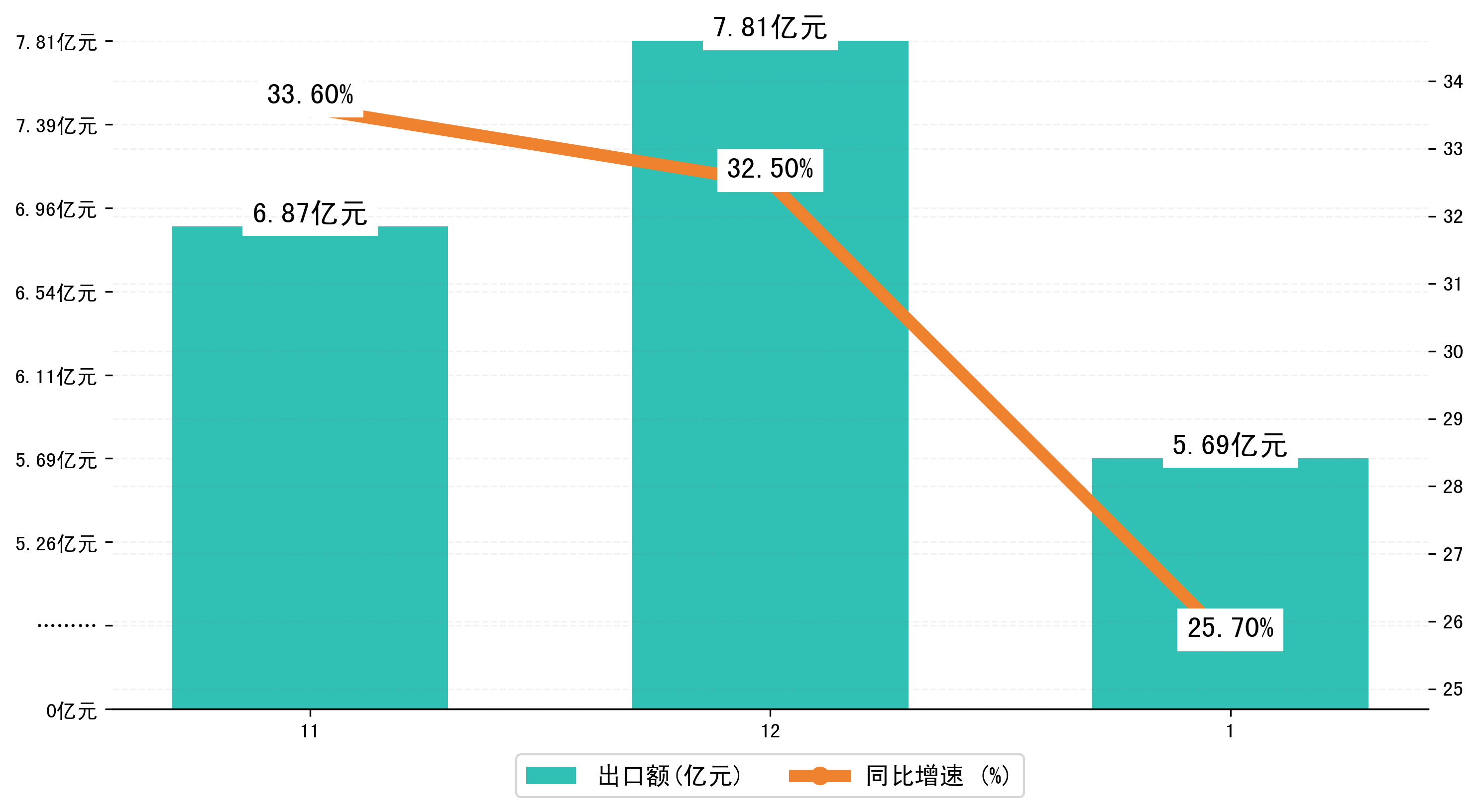 以美元计,2023年1-1月大庆市出口额为8109.6748万美元,相比上年同期增加了1016.9098万美元,同比增加14.30%。