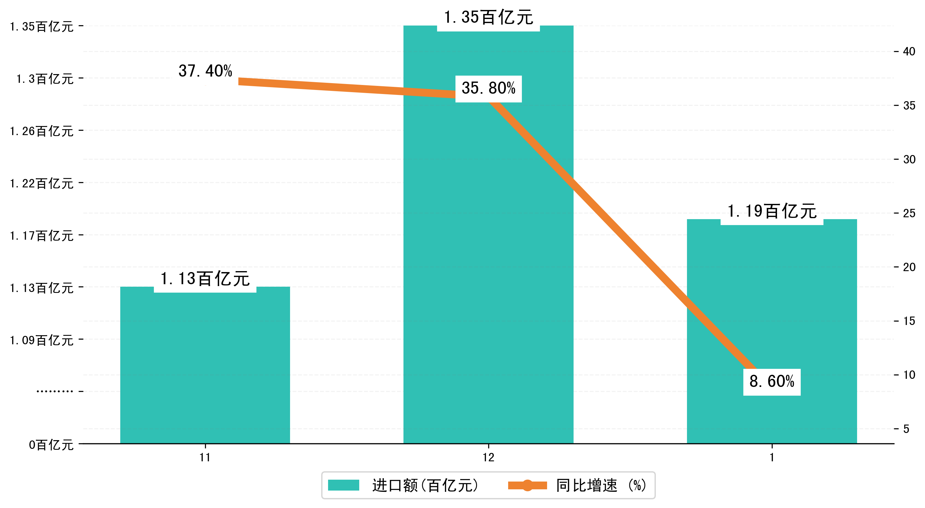以人民币计,2023年1月大庆市进口额为118,5957.9762万元,相比上月减少了16,2873.412万元;相比上年同期增加了9,3832.0419万元,同比增加了8.60%。