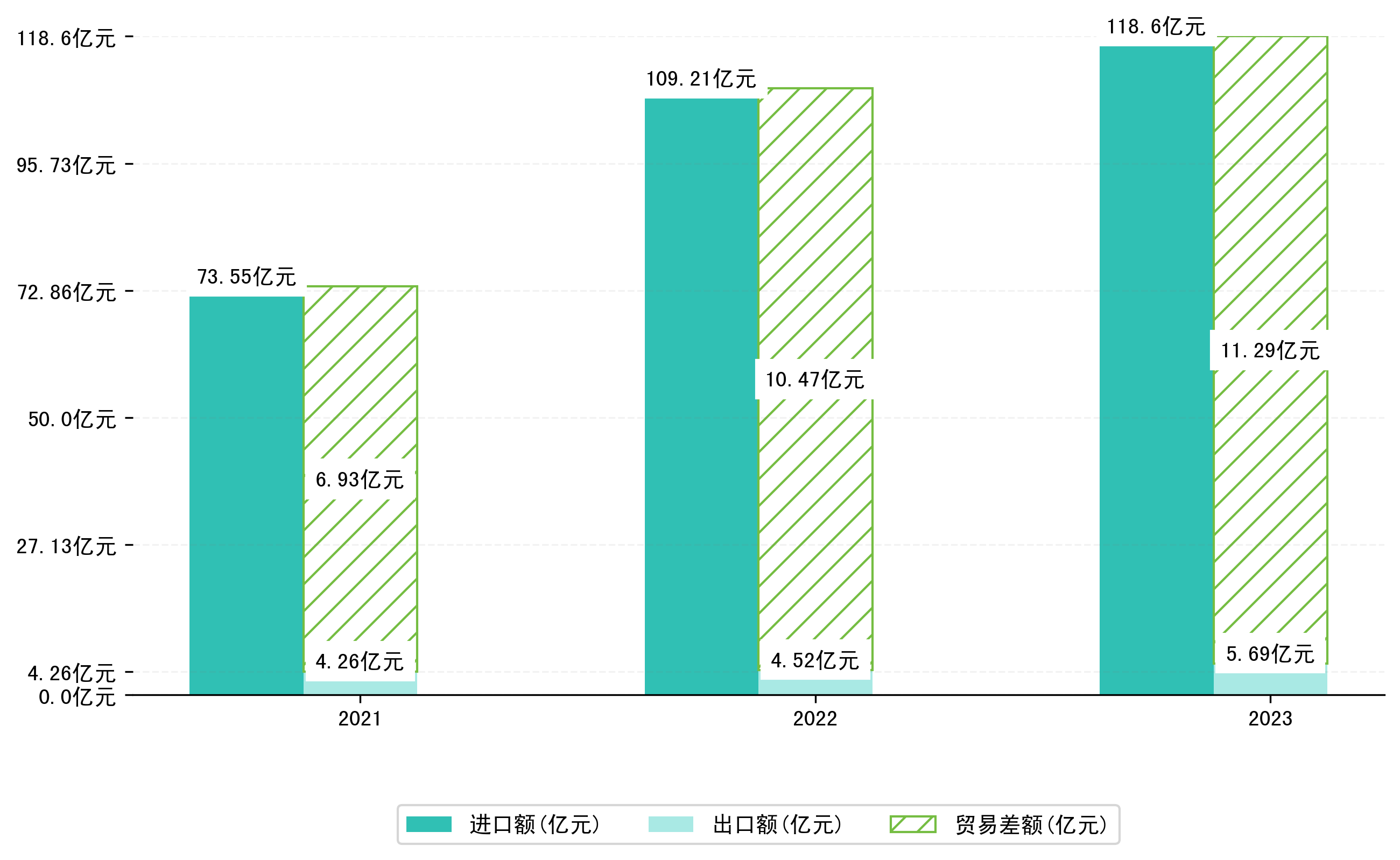 以人民币计,2023年1月大庆市贸易差额为112,9095,4163万元(贸易逆差),相比上月增加了14,1596,6365万元,即1,8557,7273万美元;相比上年同期减少了8,2201,3346万元,同比减少7.85%。