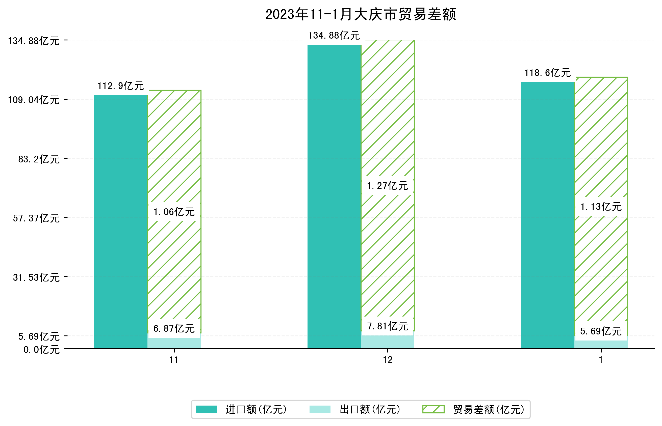 以人民币计,2023年1-1月大庆市贸易差额为112,9095,4163万元(贸易逆差),相比上年同期减少了8,2201,3346万元,同比减少7.85%。