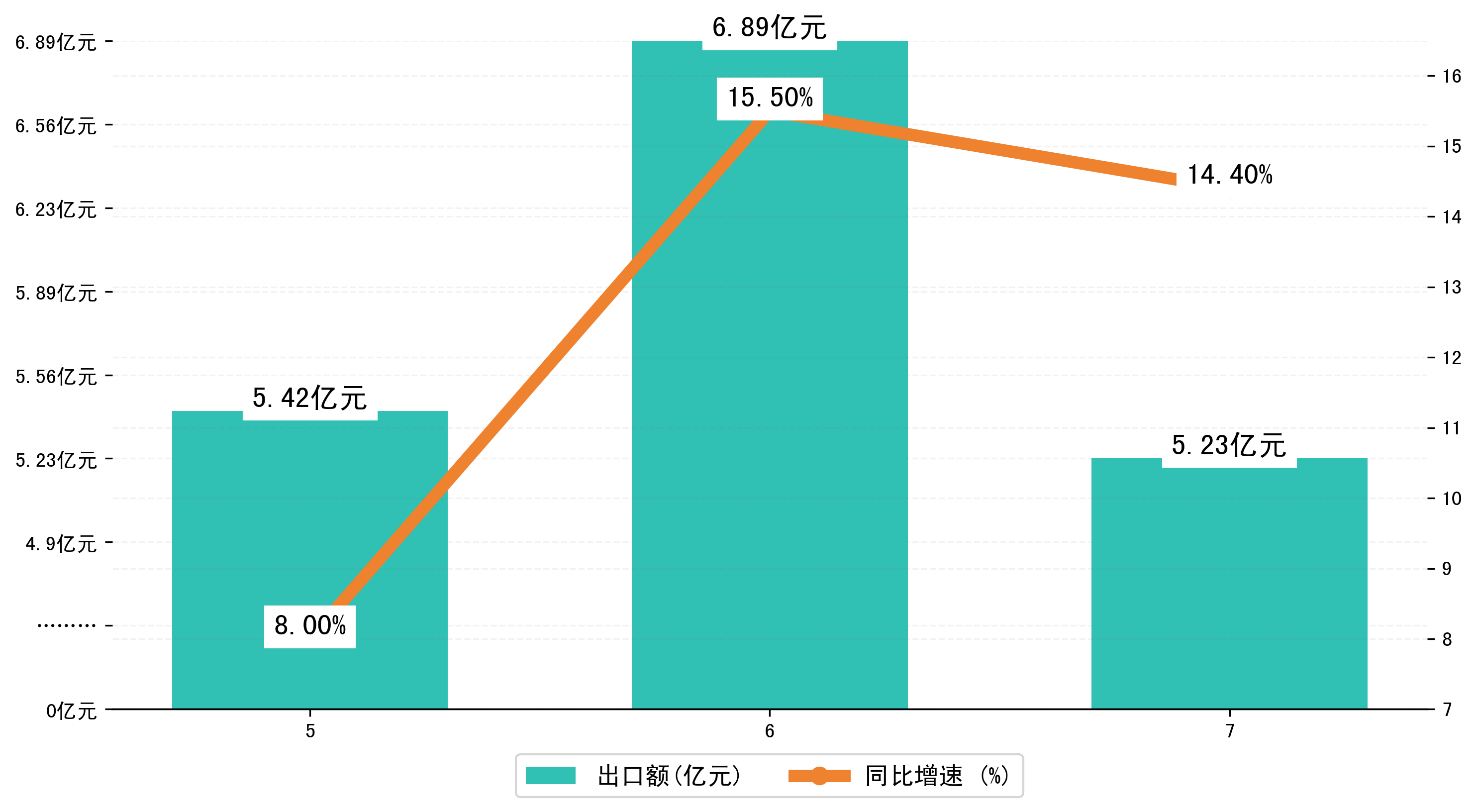 以美元计,2023年1-7月大庆市出口额为5,7185.6315万美元,相比上年同期增加了3459.0662万美元,同比增加6.40%。