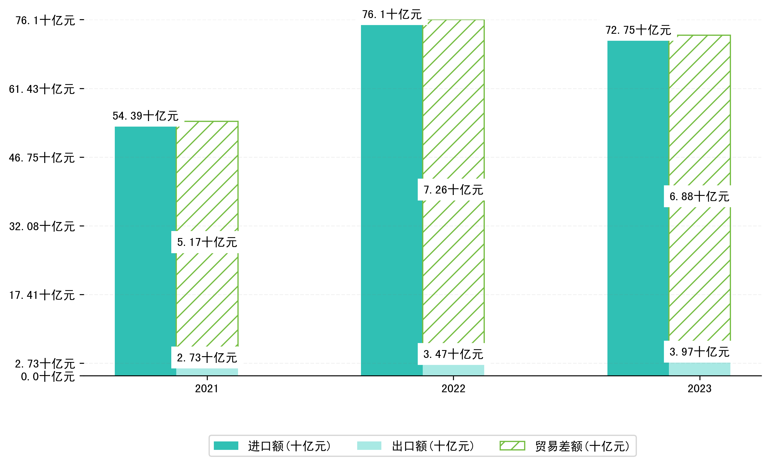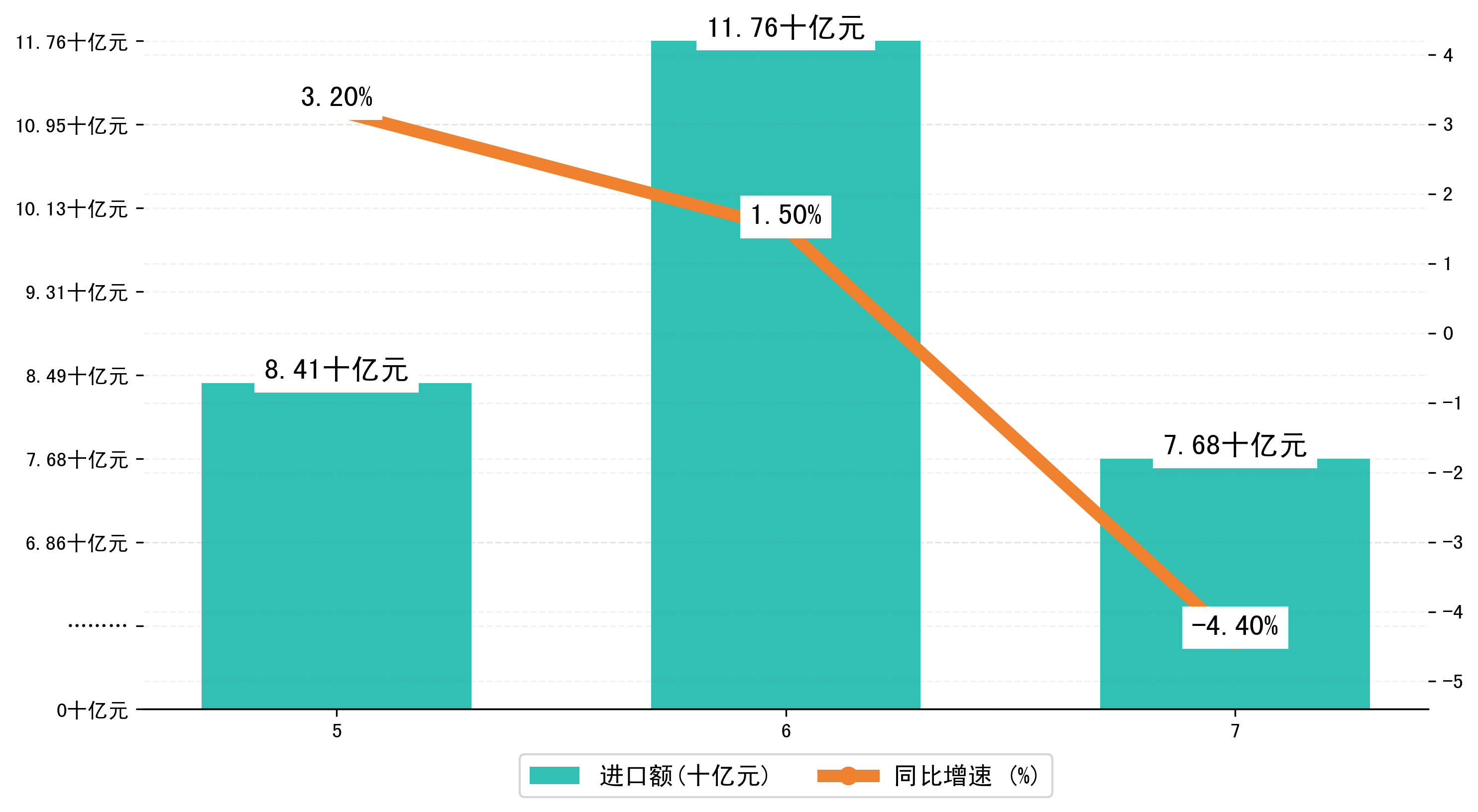 以美元计,2023年1-7月大庆市进口额为105,2660.2645万美元,相比上年同期减少了12,0297.4001万美元,同比减少-10.30%。