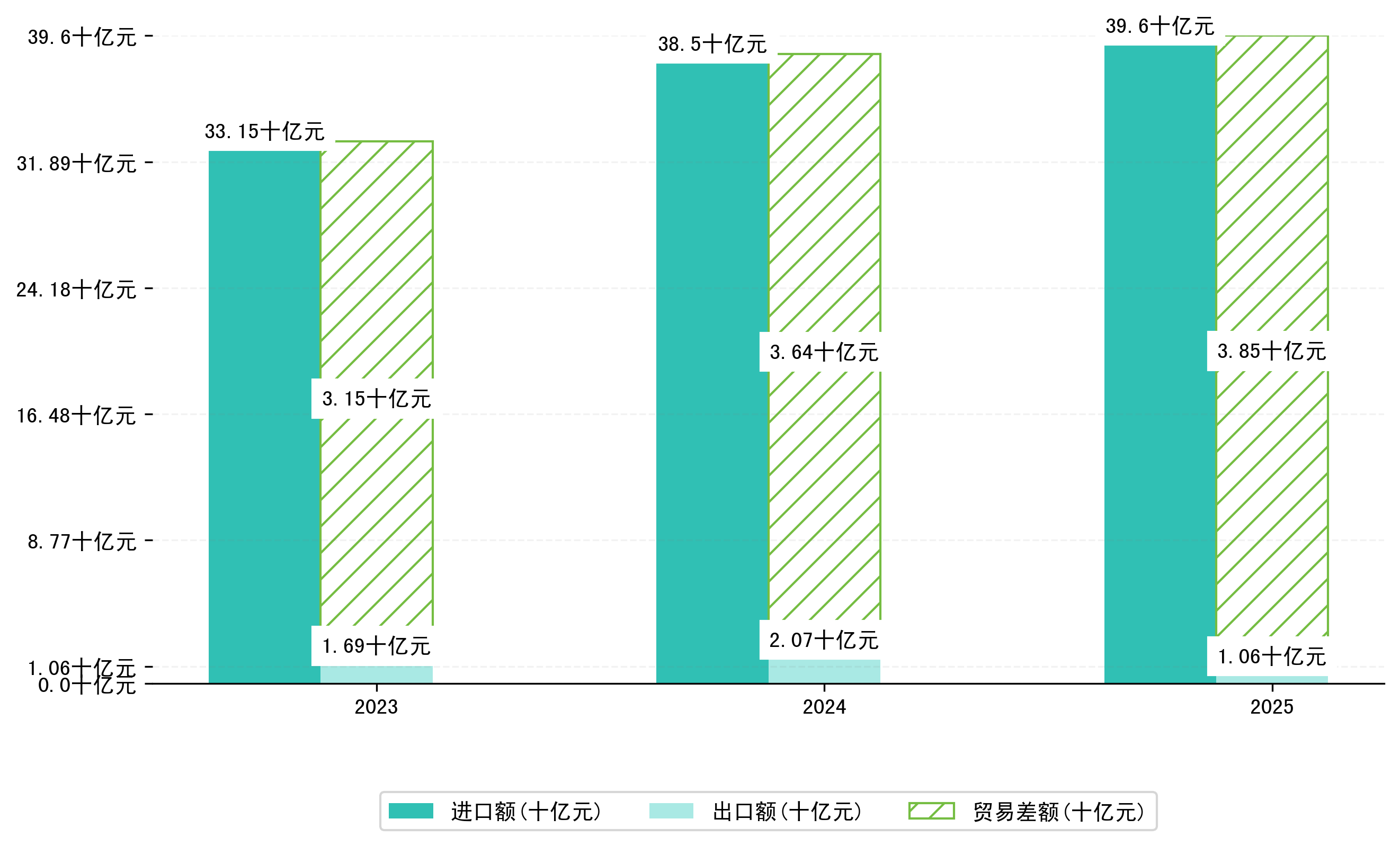 以人民币计,2025年1-3月大庆市贸易差额为385,3762,3373万元(贸易逆差),相比上年同期减少了21,1286,8648万元,同比减少5.8%。