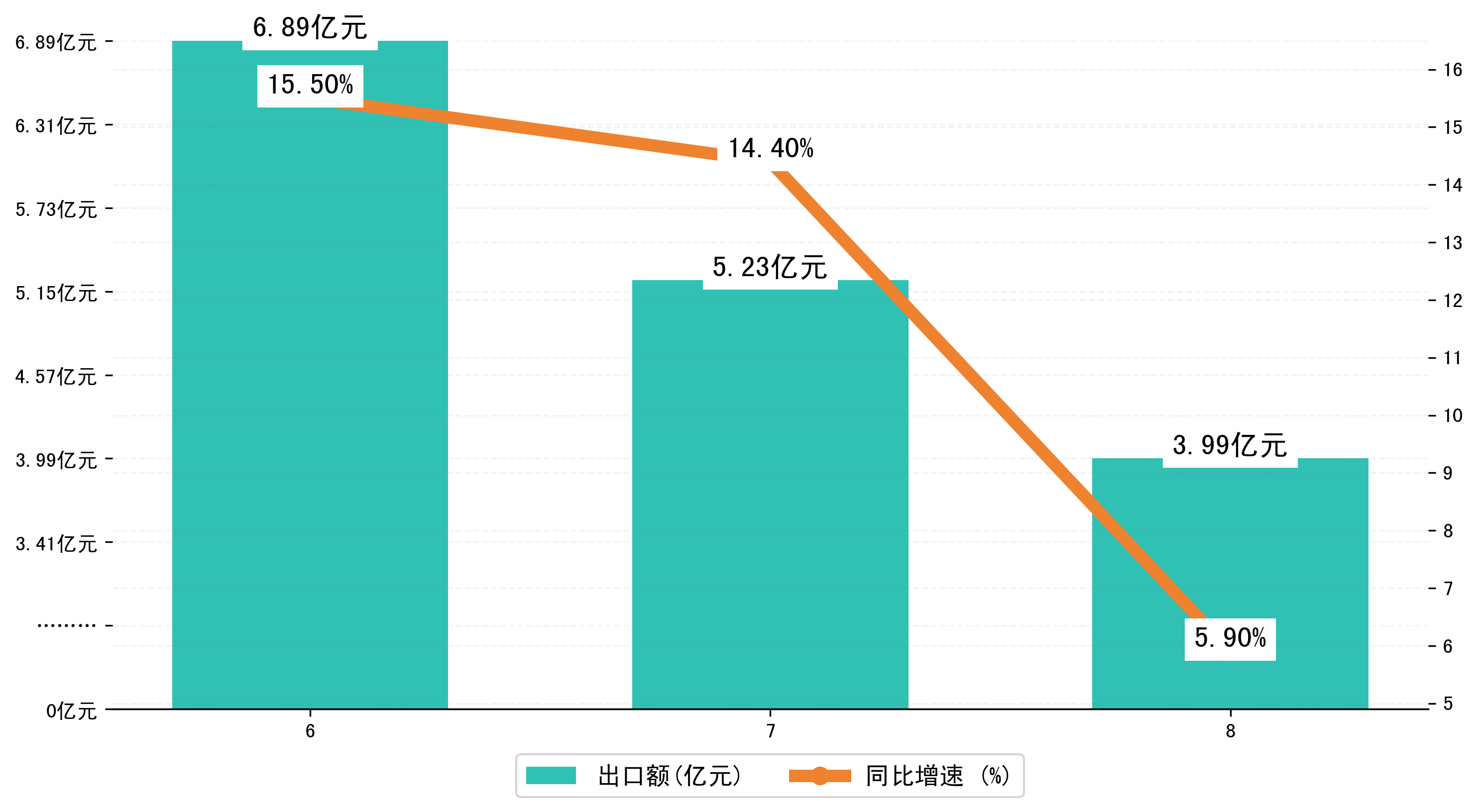 以美元计,2023年1-8月大庆市出口额为6,2770.1471万美元,相比上年同期增加了637.4069万美元,同比增加-1.00%。