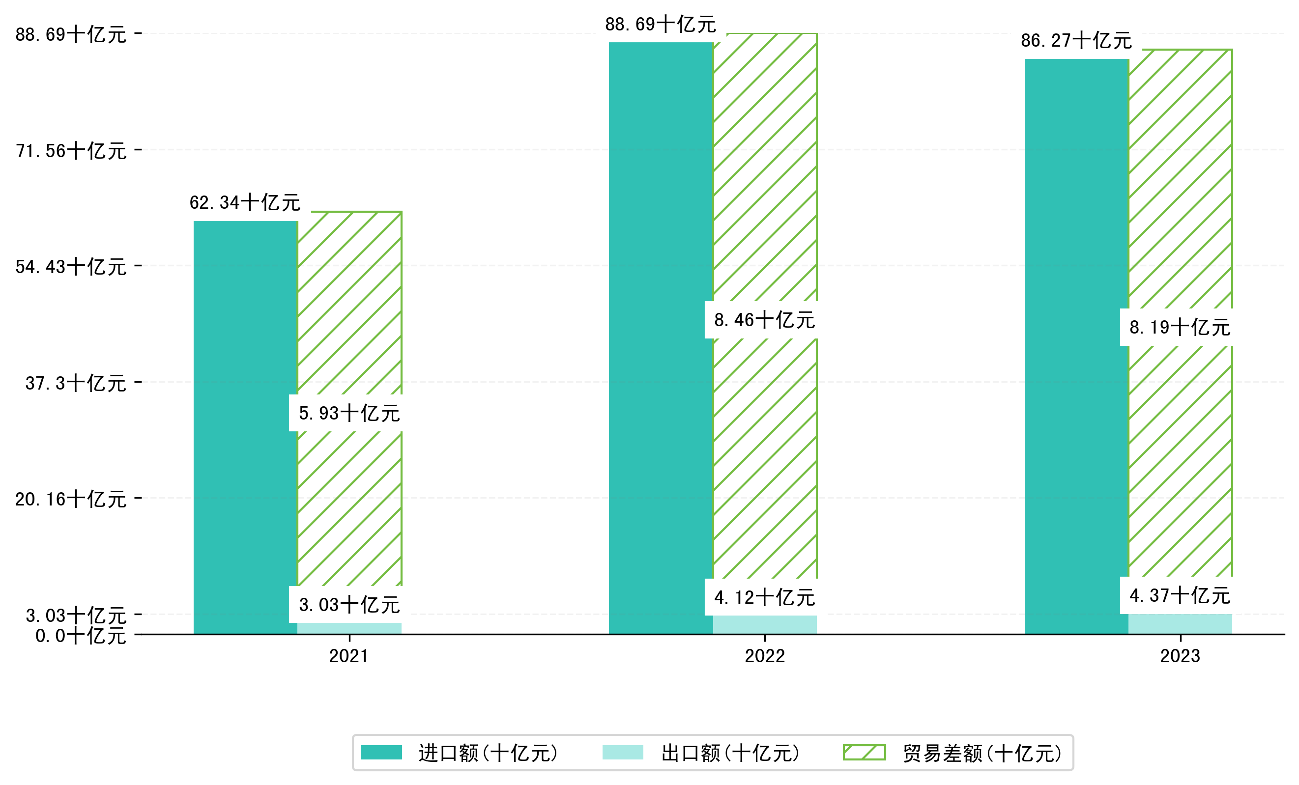 以人民币计,2023年8月大庆市贸易差额为131,2362,5403万元(贸易逆差),相比上月减少了59,7088,6356万元,即8,3949,3289万美元;相比上年同期减少了11,8137,6506万元,同比减少9.89%。