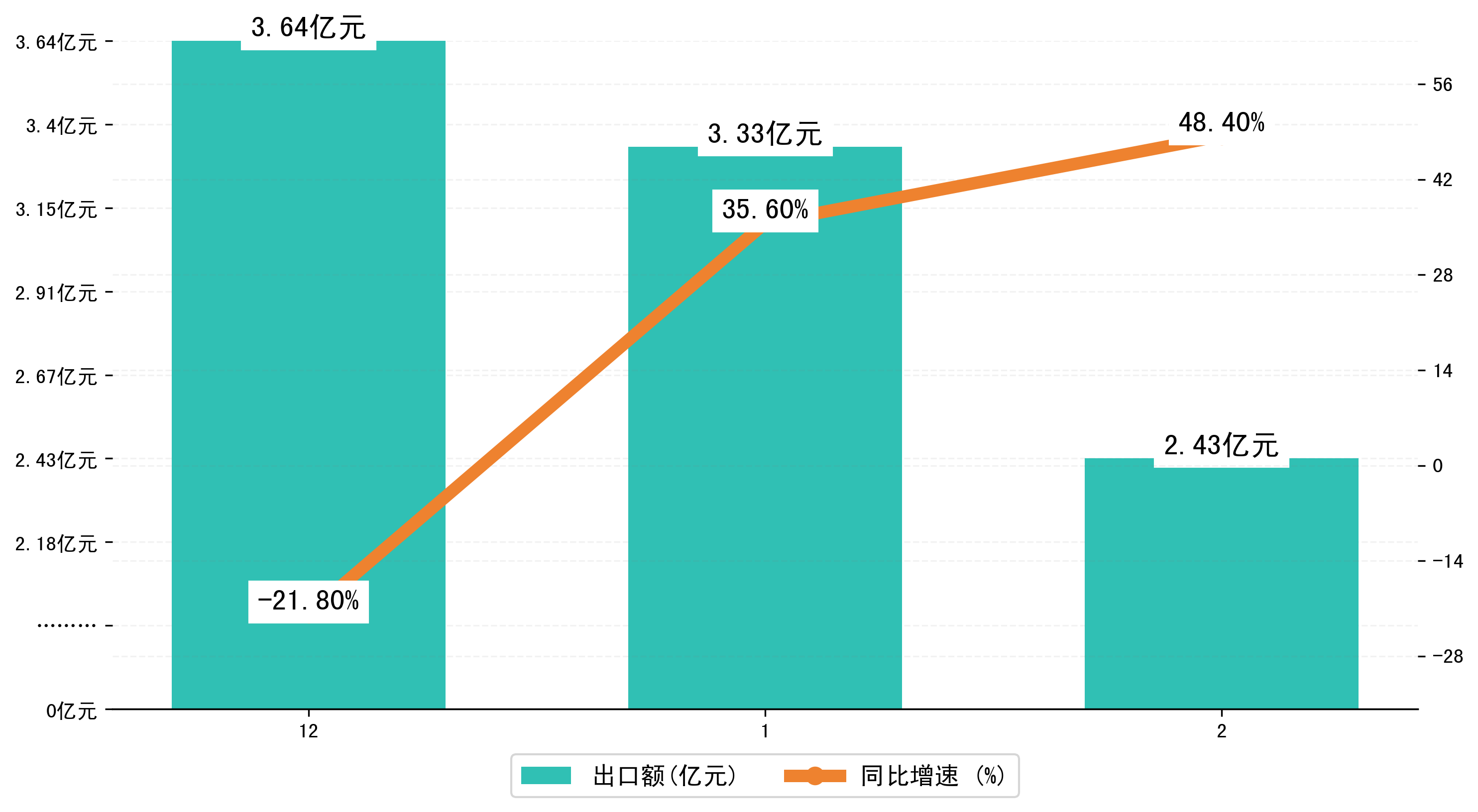 以人民币计,2023年1-2月大同市出口额为5,7582.5948万元,相比上年同期增加了1,8784.8338万元,同比增加了48.40%。
