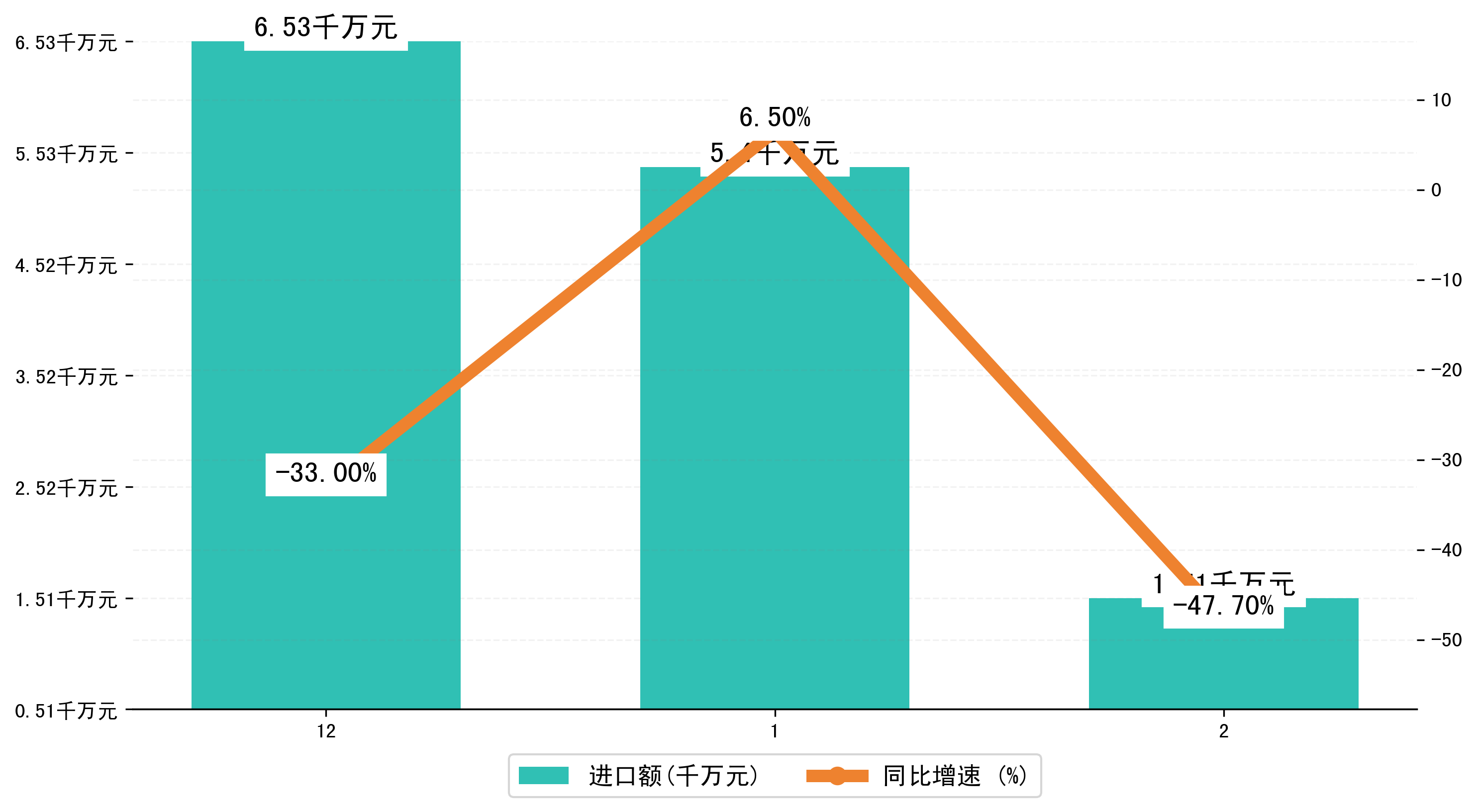 以美元计,2023年1-2月大同市进口额为997.3246万美元,相比上年同期减少了1077.9473万美元,同比减少-51.90%。