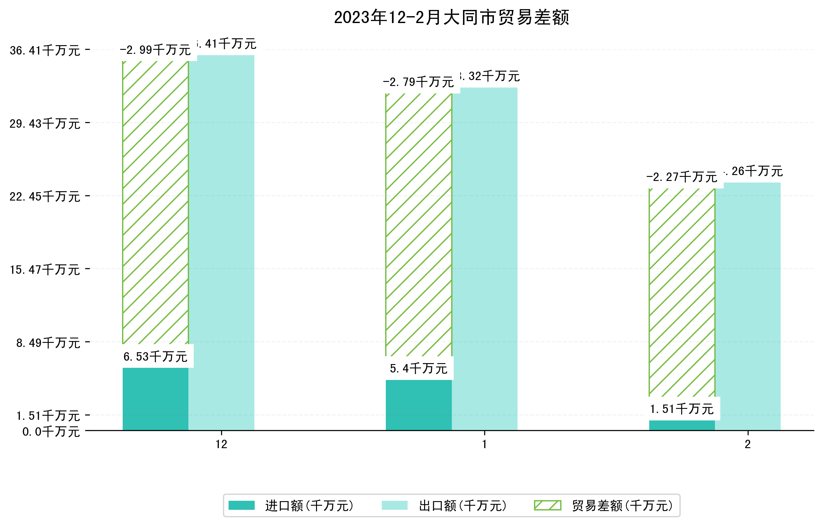 以美元计,2023年1-2月大同市贸易差额为7357,1575万美元(贸易顺差),相比上年同期增加了3346,1260万美元,同比增加83.42%。