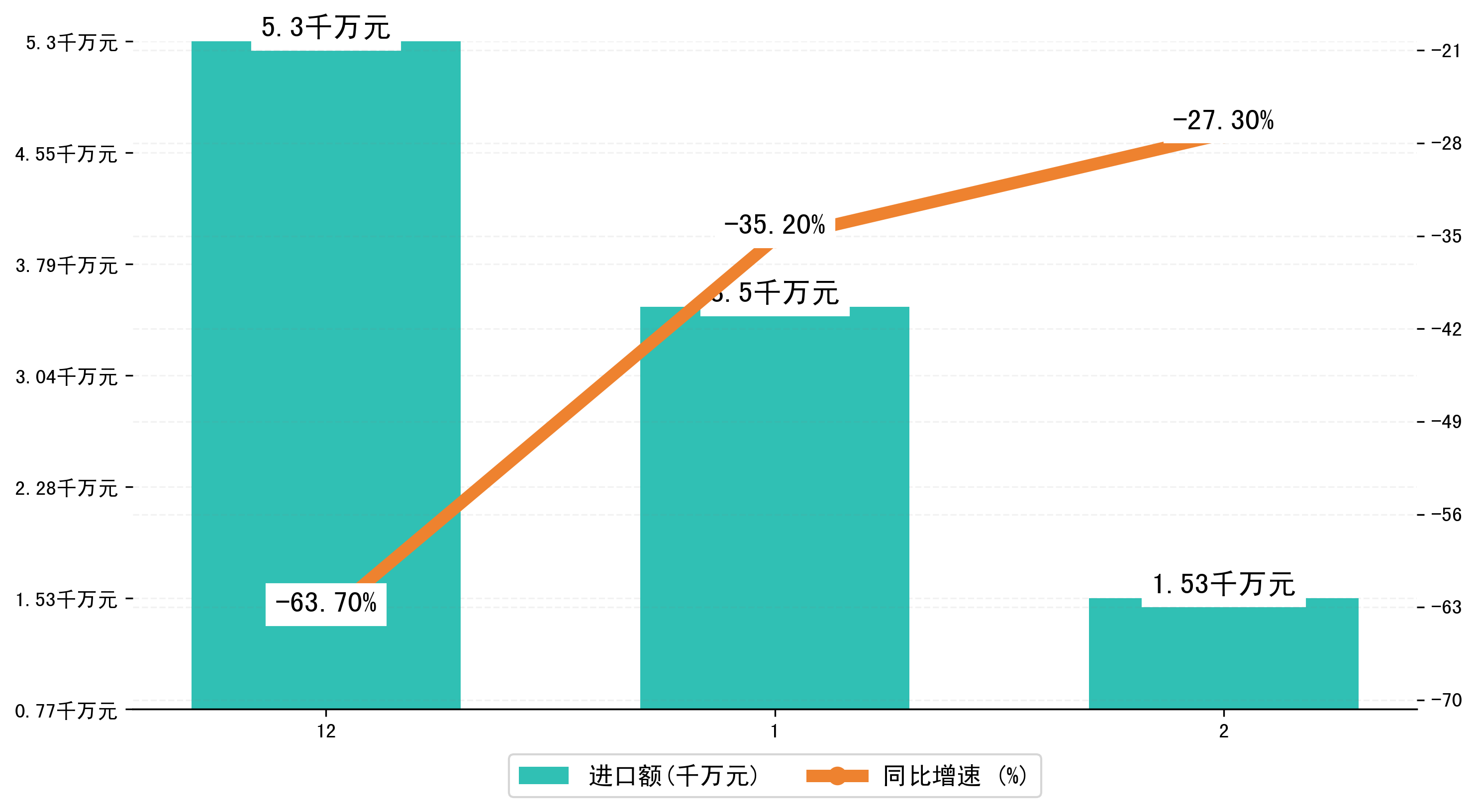 以美元计,2024年2月大同市进口额为215.6514万美元,相比上月减少了279.4885万美元;相比上年同期增加了7.1537万美元,同比减少-28.70%。
