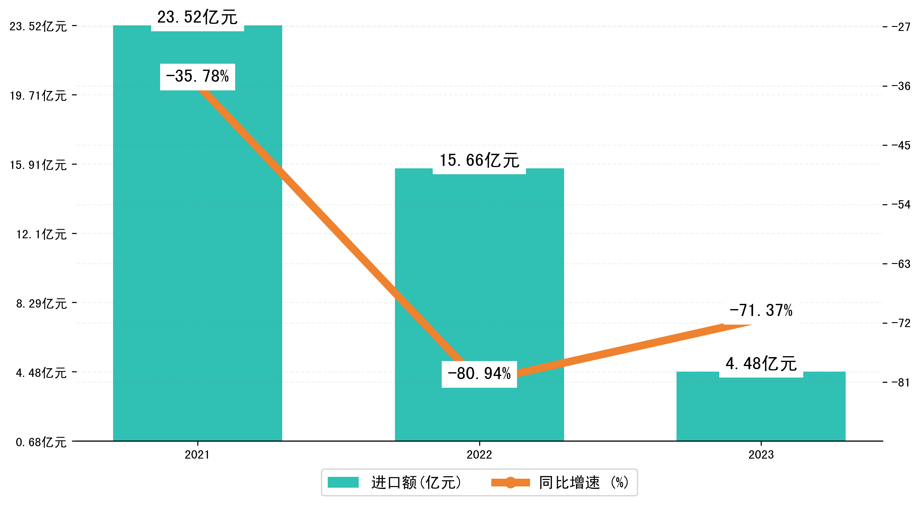 以人民币计,2023年1-12月大同市进口额为4,4835.4752万元,相比上年同期减少了11,1747.8428万元,同比减少了-63.70%。