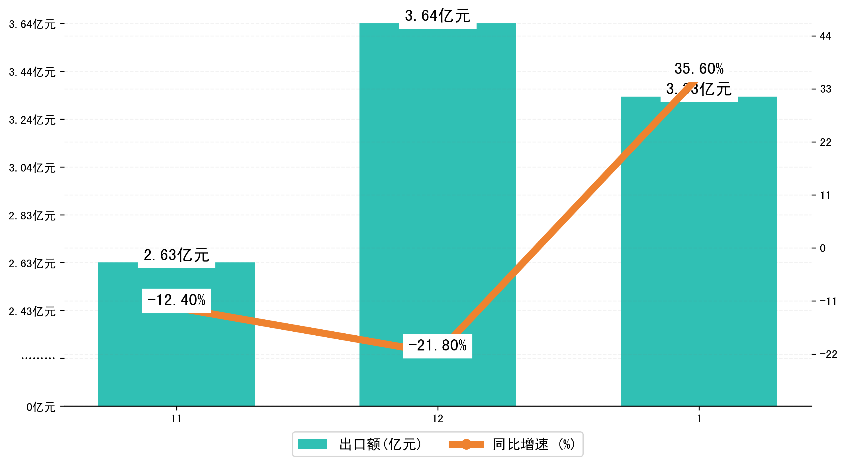 以人民币计,2023年1-1月大同市出口额为3,3324.1394万元,相比上年同期增加了8748.1255万元,同比增加了35.60%。