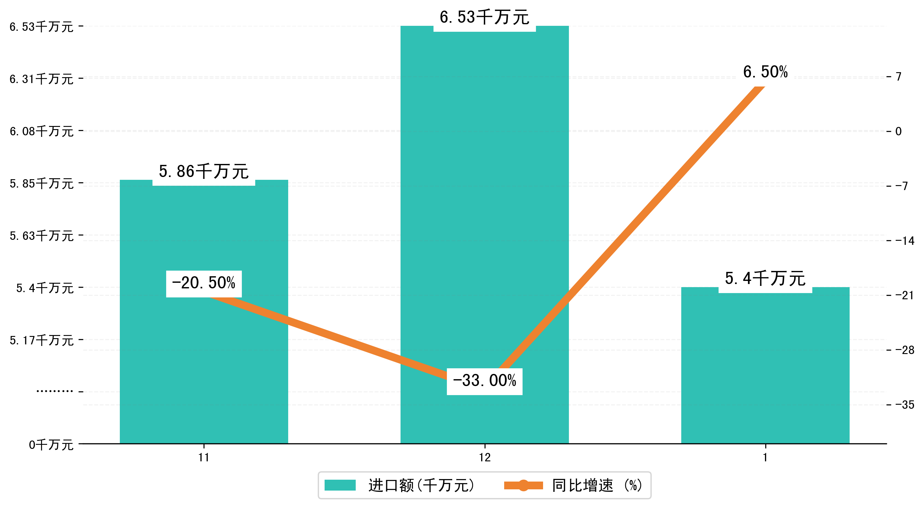 以人民币计,2023年1-1月大同市进口额为5399.3807万元,相比上年同期增加了327.3352万元,同比增加了6.50%。