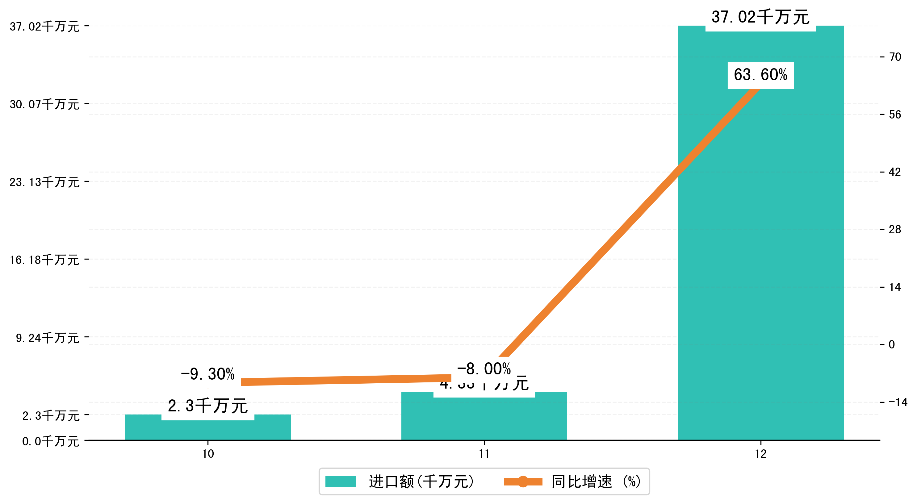 以人民币计,2024年12月大同市进口额为3,7015.9657万元,相比上月增加了3,2683.5231万元;相比上年同期增加了3,1716.4098万元,同比增加了63.60%。