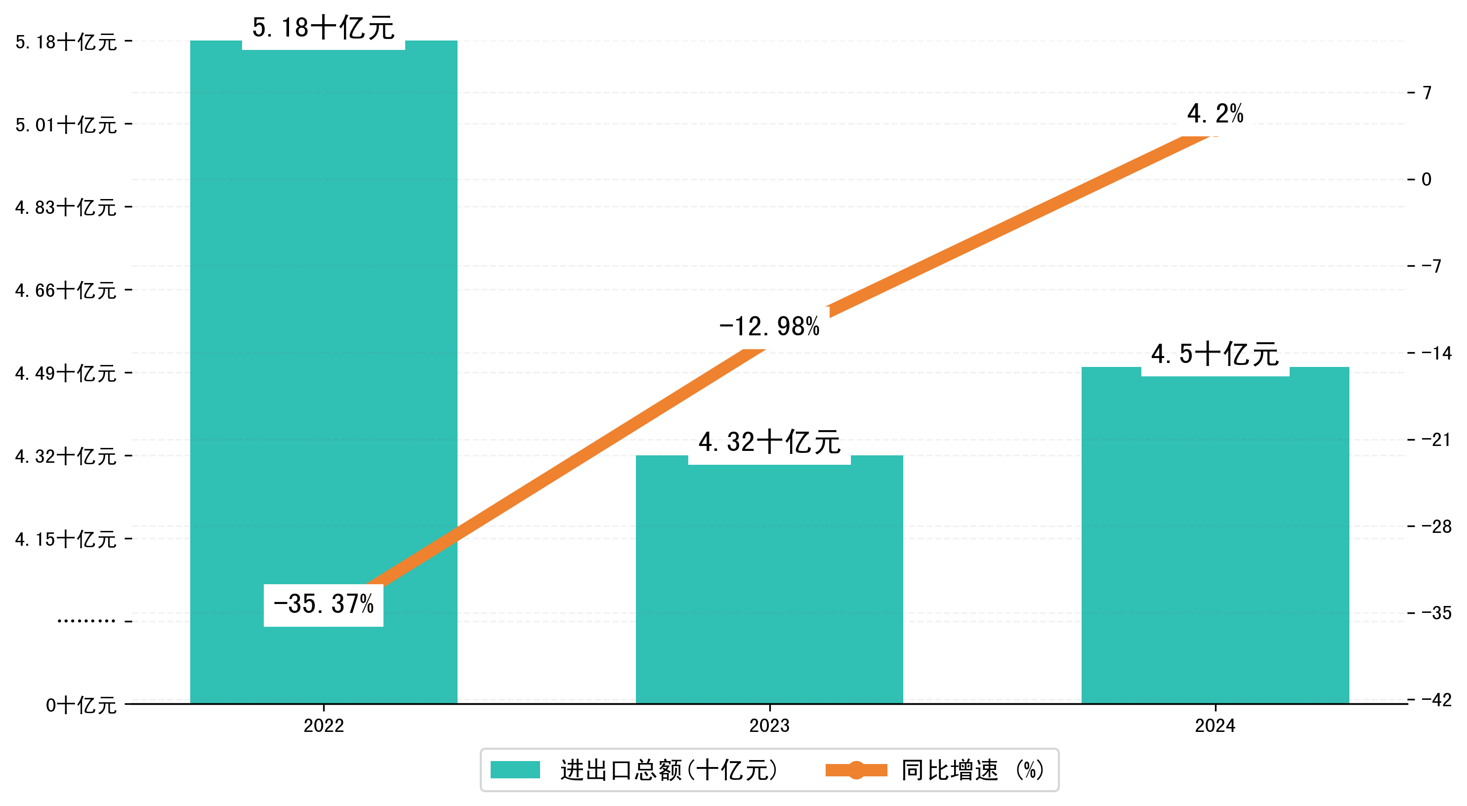 以人民币计,2024年1-12月大同市进出口总额为45,0394.2917万元,相比上年同期增加了1,8160.6758万元,同比增加了4.20%。