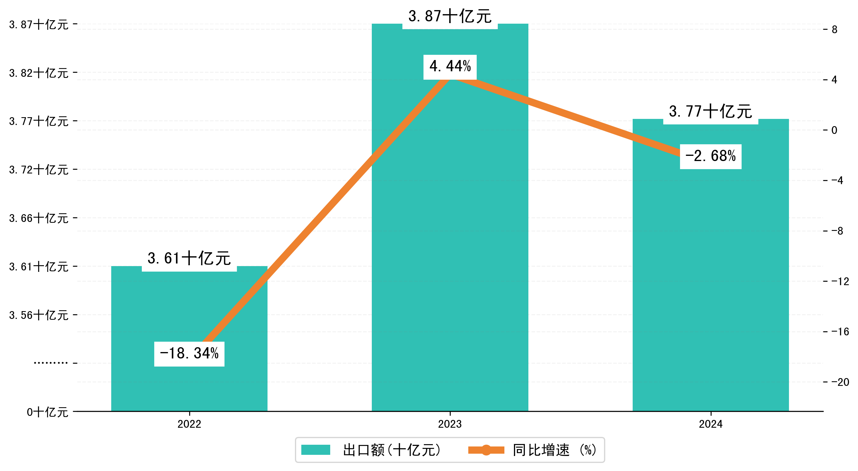 以人民币计,2024年1-12月大同市出口额为37,7030.3522万元,相比上年同期减少了1,0367.7885万元,同比减少了-2.70%。