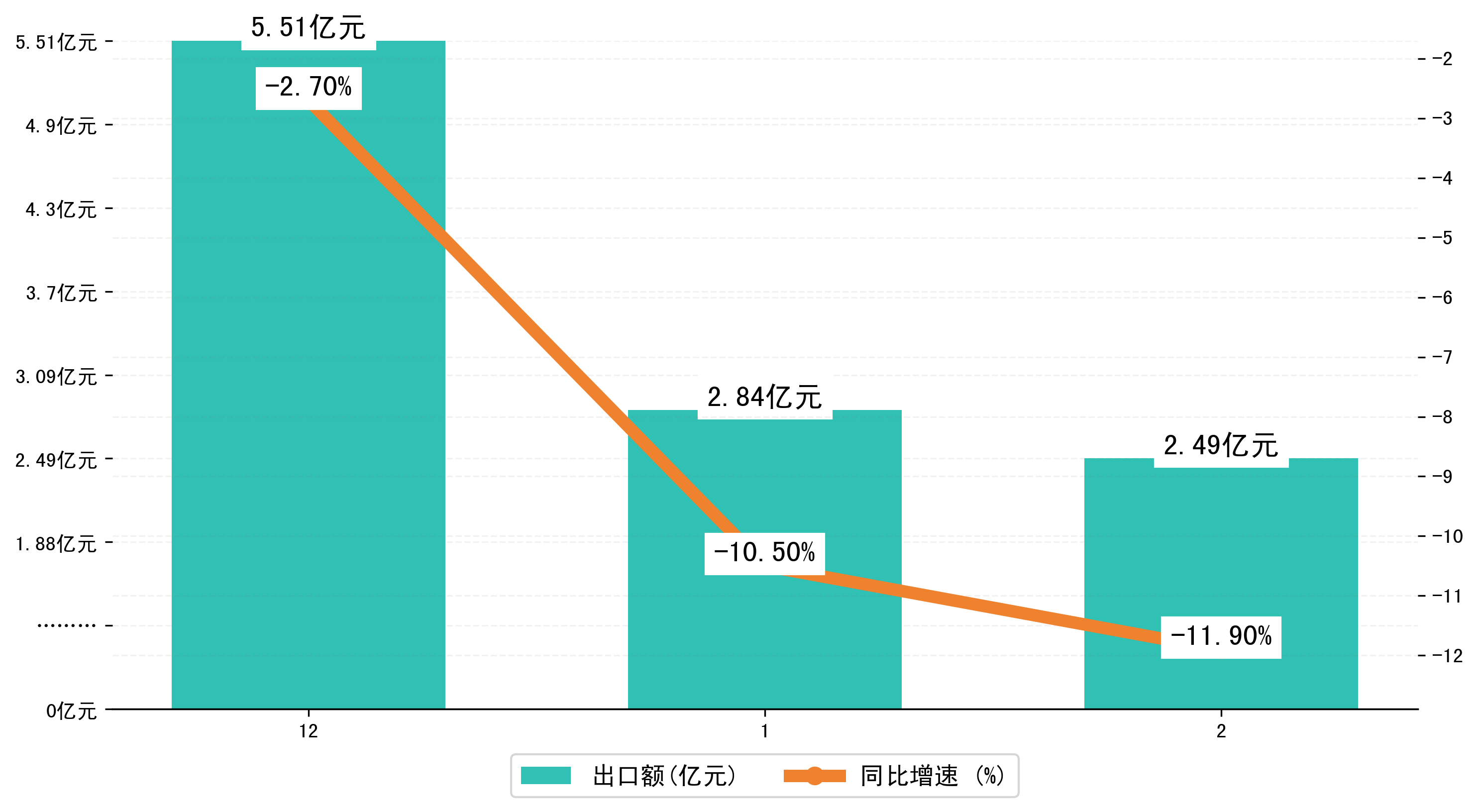 以人民币计,2025年1-2月大同市出口额为5,3280.7894万元,相比上年同期减少了9800.5885万元,同比减少了-11.90%。