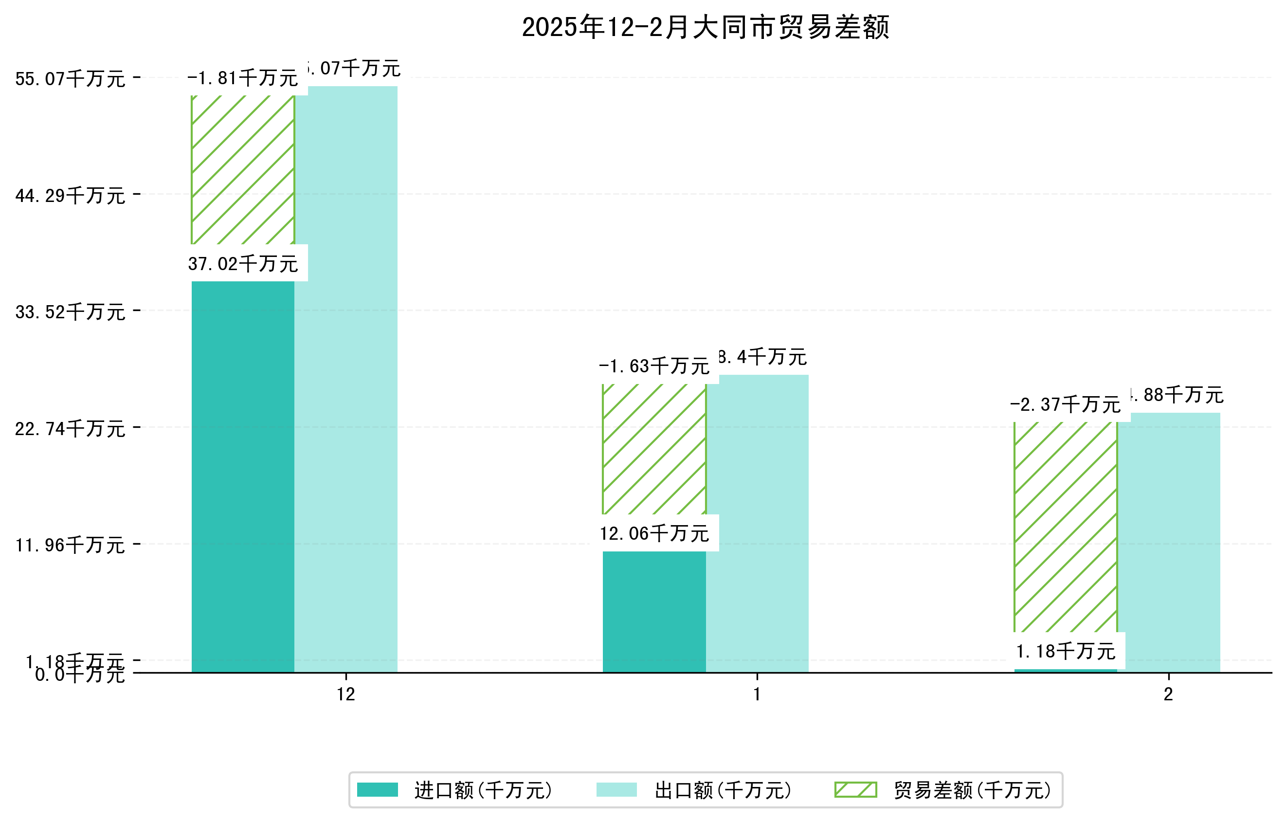 以美元计,2025年1-2月大同市贸易差额为5567,8386万美元(贸易顺差),相比上年同期减少了2591,1212万美元,同比减少-31.76%。