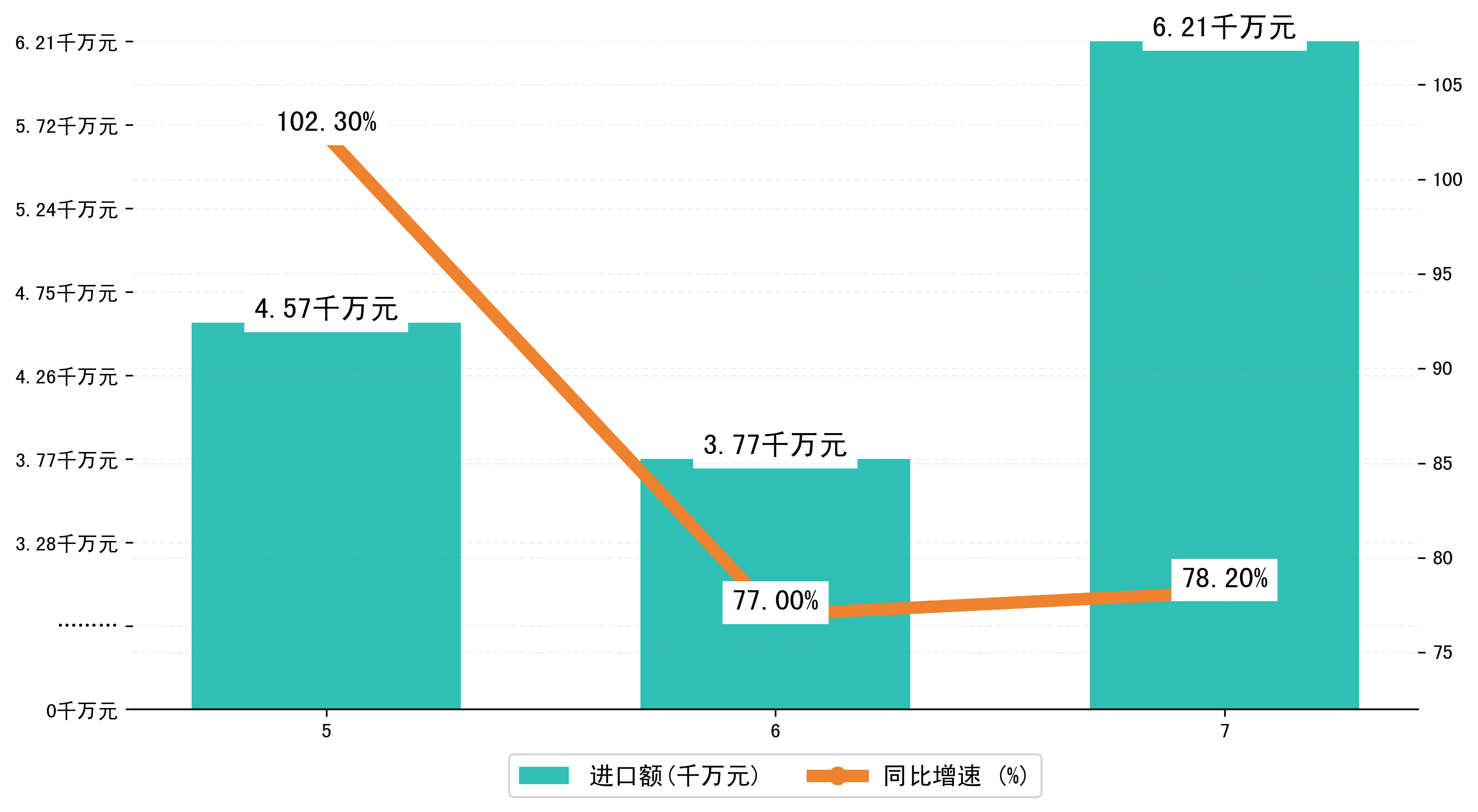 以人民币计,2025年7月大同市进口额为6211.8989万元,相比上月增加了2439.279万元;相比上年同期增加了2847.8002万元,同比增加了78.20%。