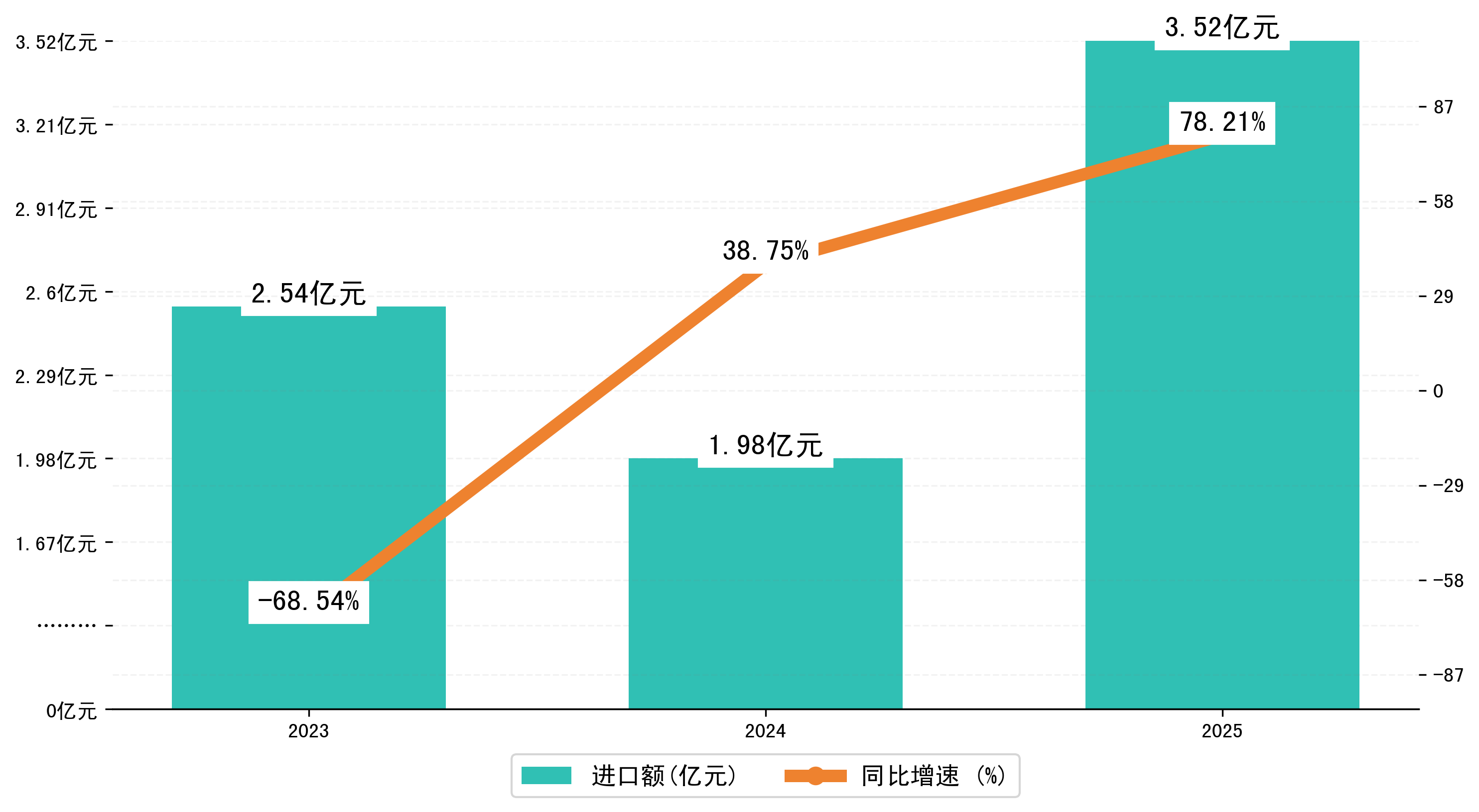 以人民币计,2025年1-7月大同市进口额为3,5240.5752万元,相比上年同期增加了1,5465.9491万元,同比增加了78.20%。