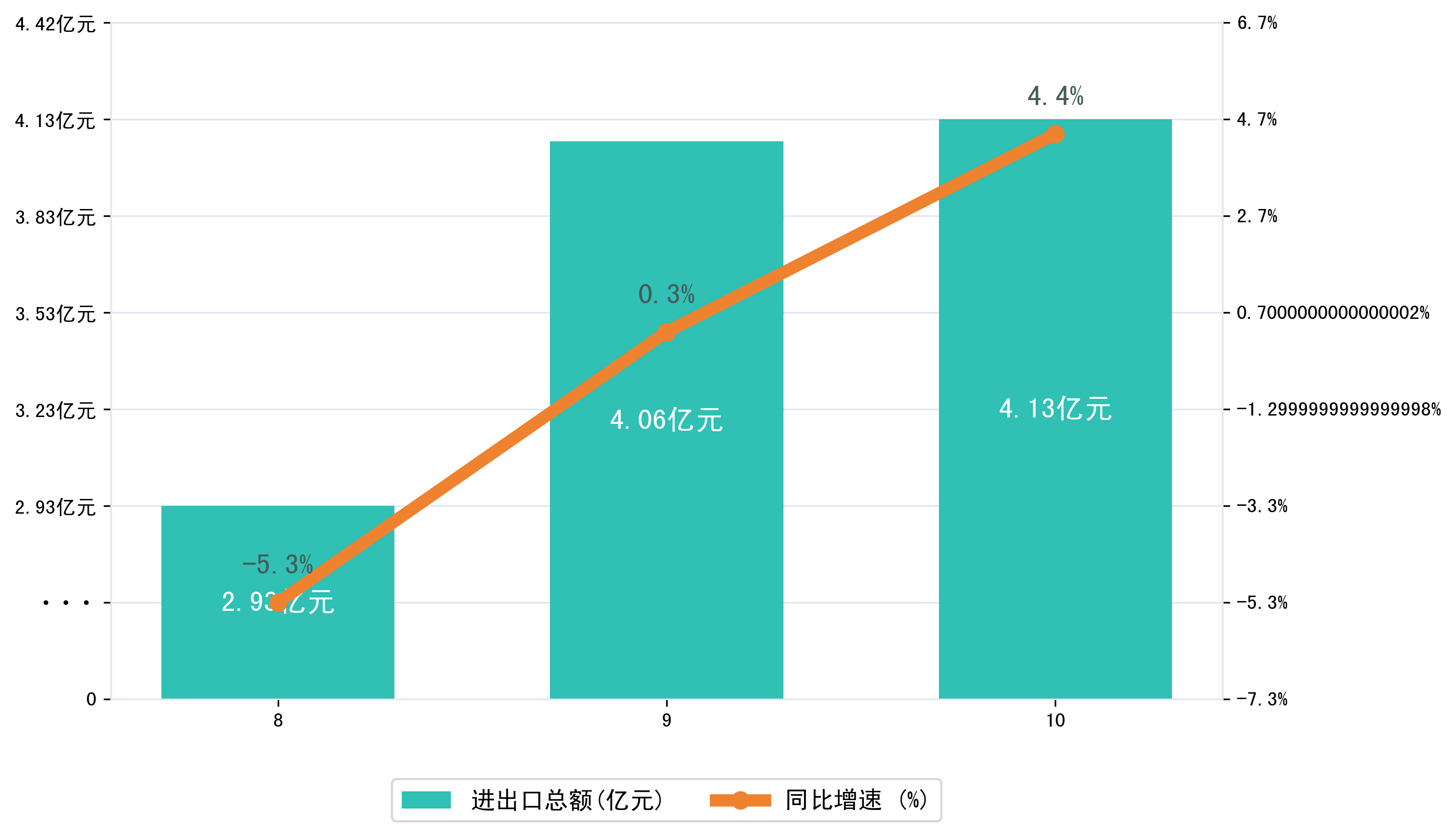 以美元计,2025年1-10月大同市进出口总额为4,4538.717万美元,相比上年同期增加了1535.5028万美元,同比增加3.60%。