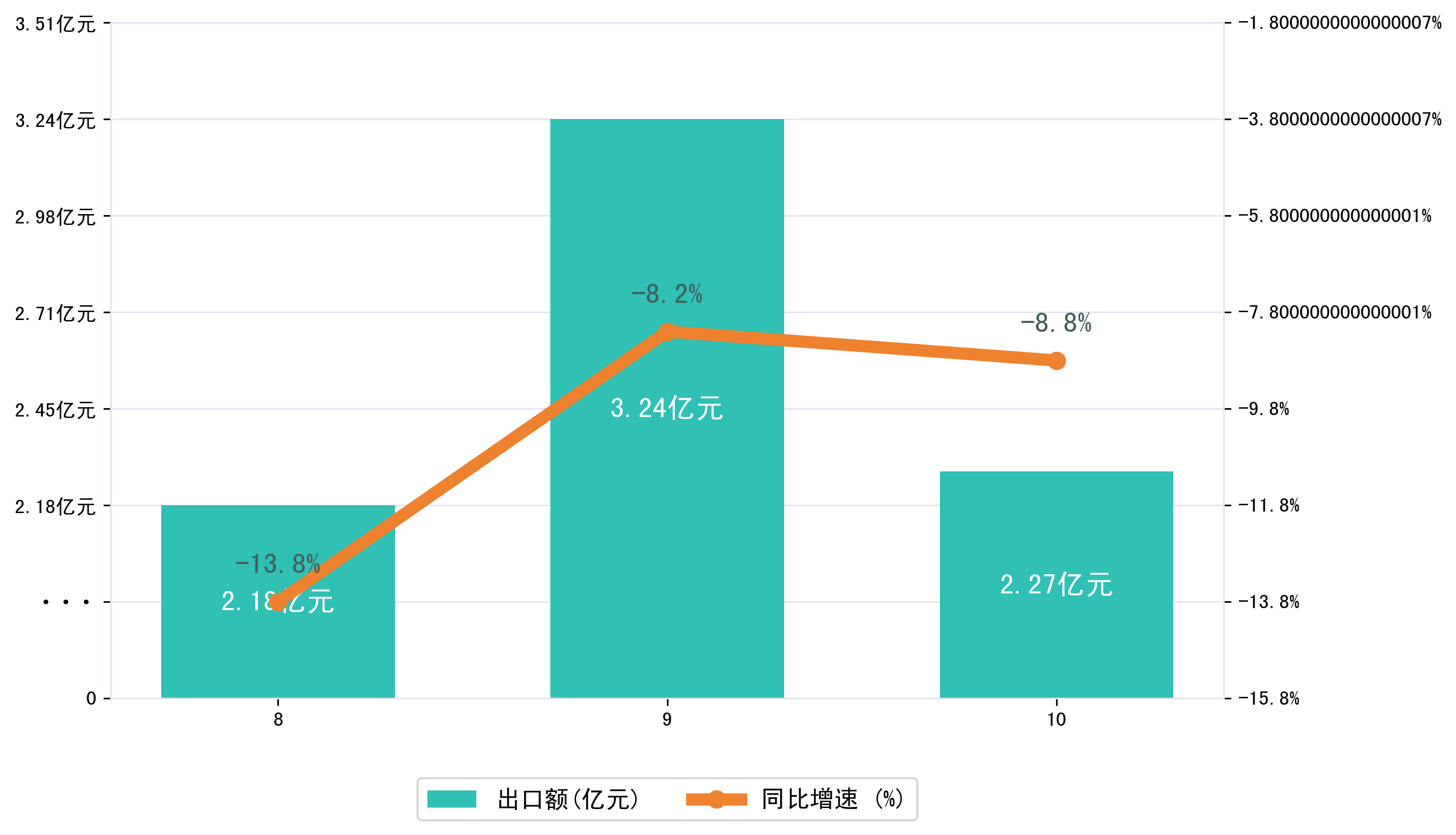 以人民币计,2025年10月大同市出口额为2,2746.3413万元,相比上月减少了9662.3742万元;相比上年同期减少了3619.7635万元,同比减少了-8.80%。