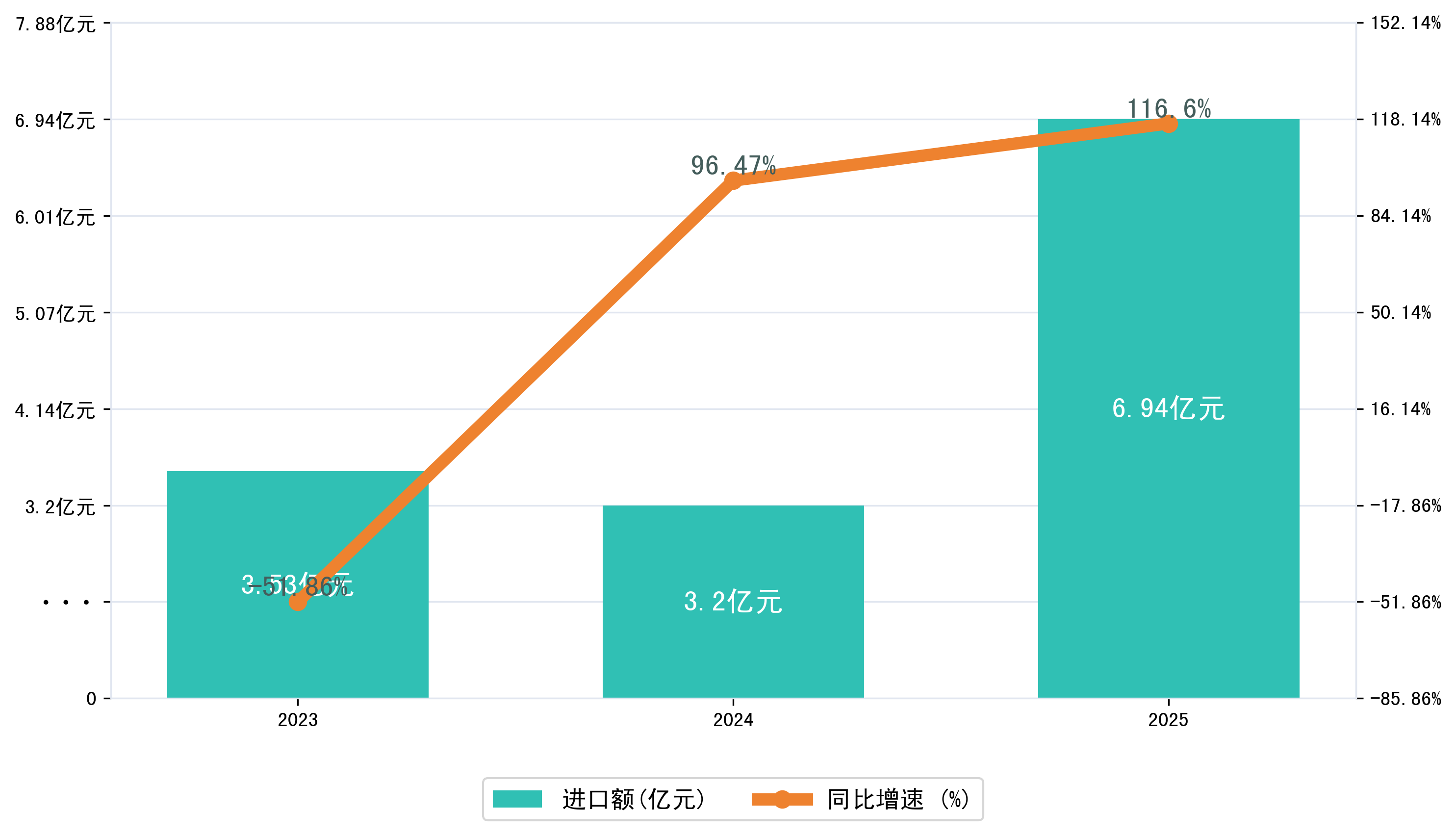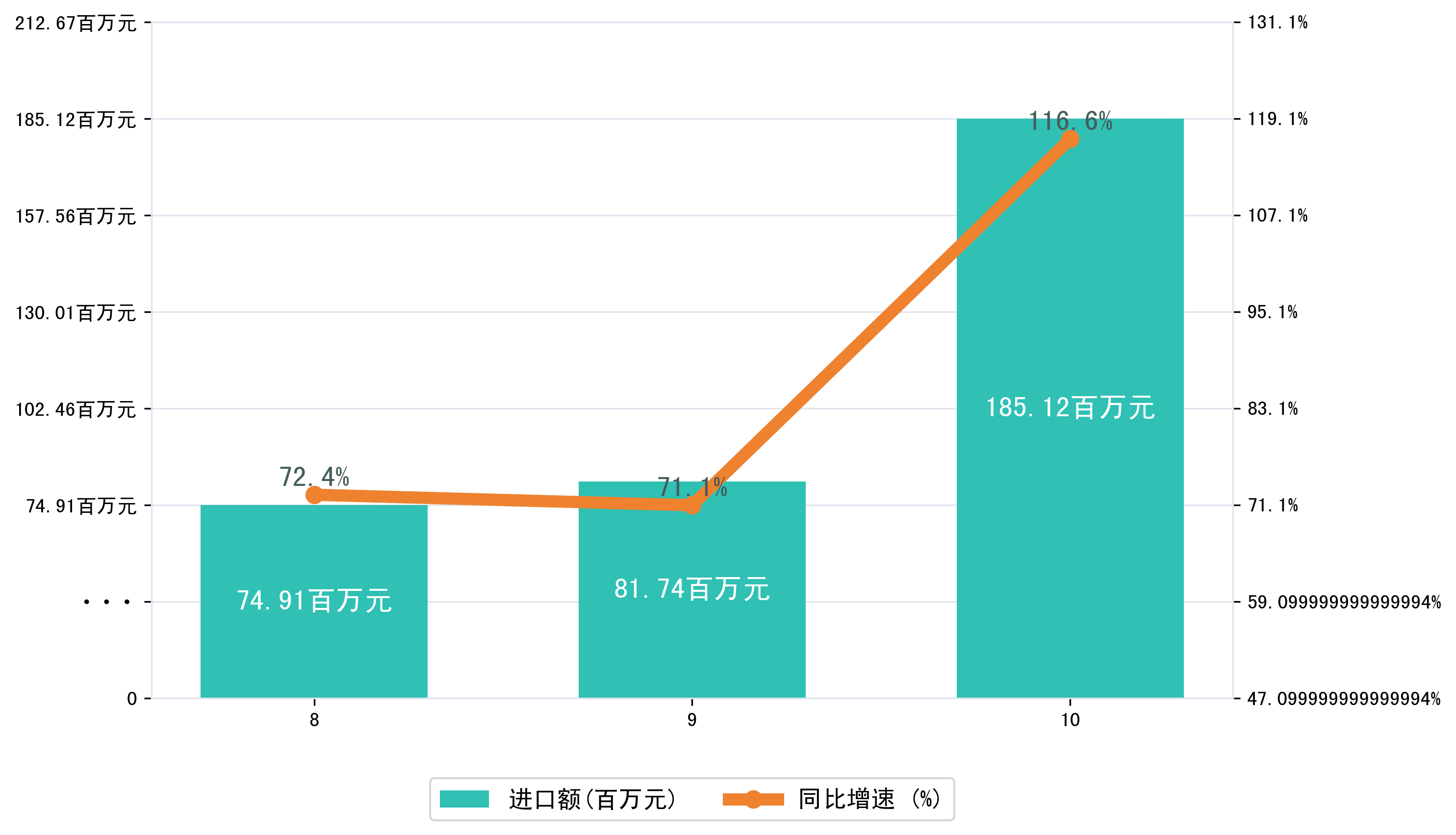 以人民币计,2025年1-10月大同市进口额为6,9417.9394万元,相比上年同期增加了3,7368.554万元,同比增加了116.60%。
