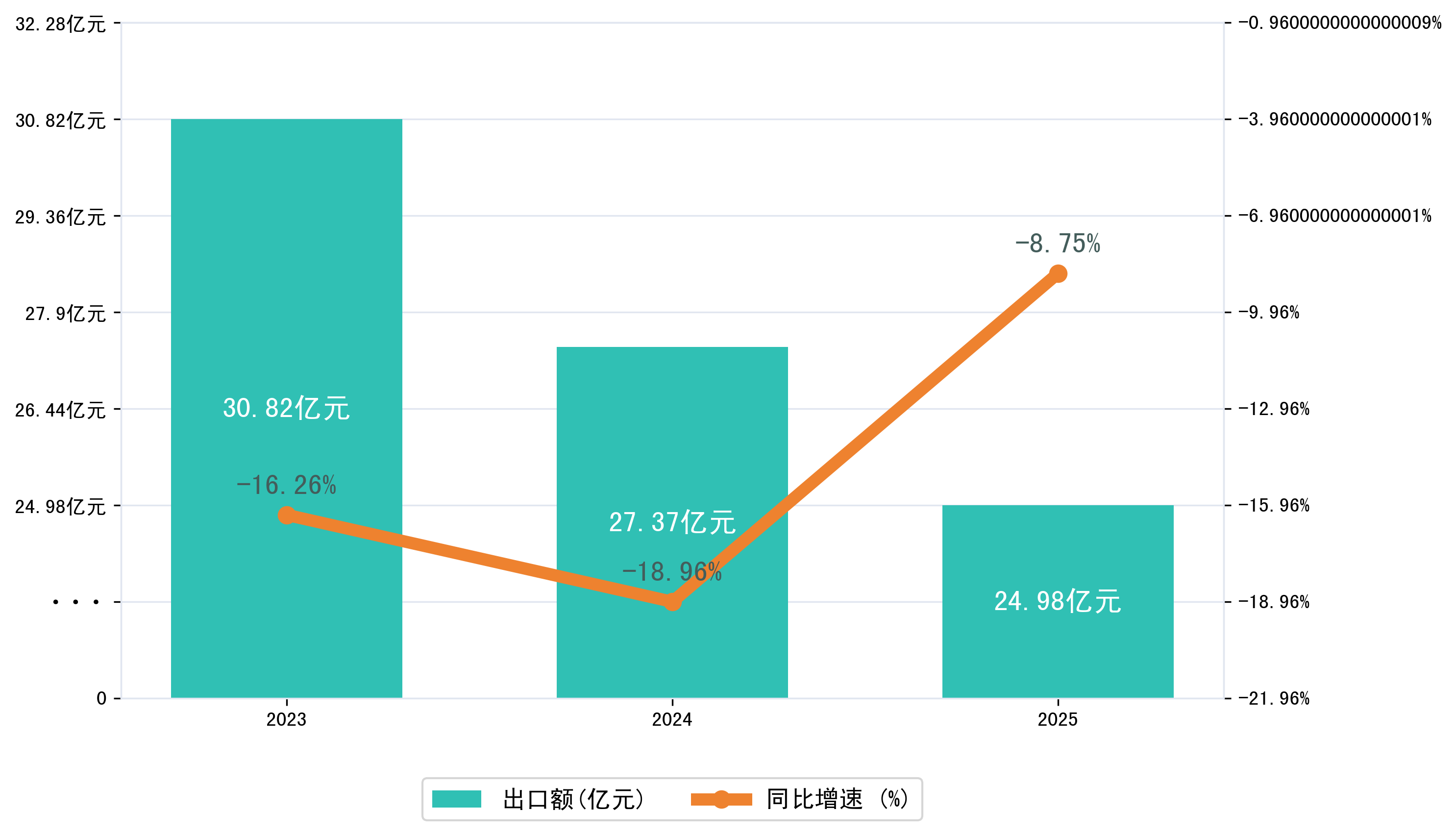 以美元计,2025年1-10月大同市出口额为3,4837.125万美元,相比上年同期减少了3665.9024万美元,同比减少-9.50%。