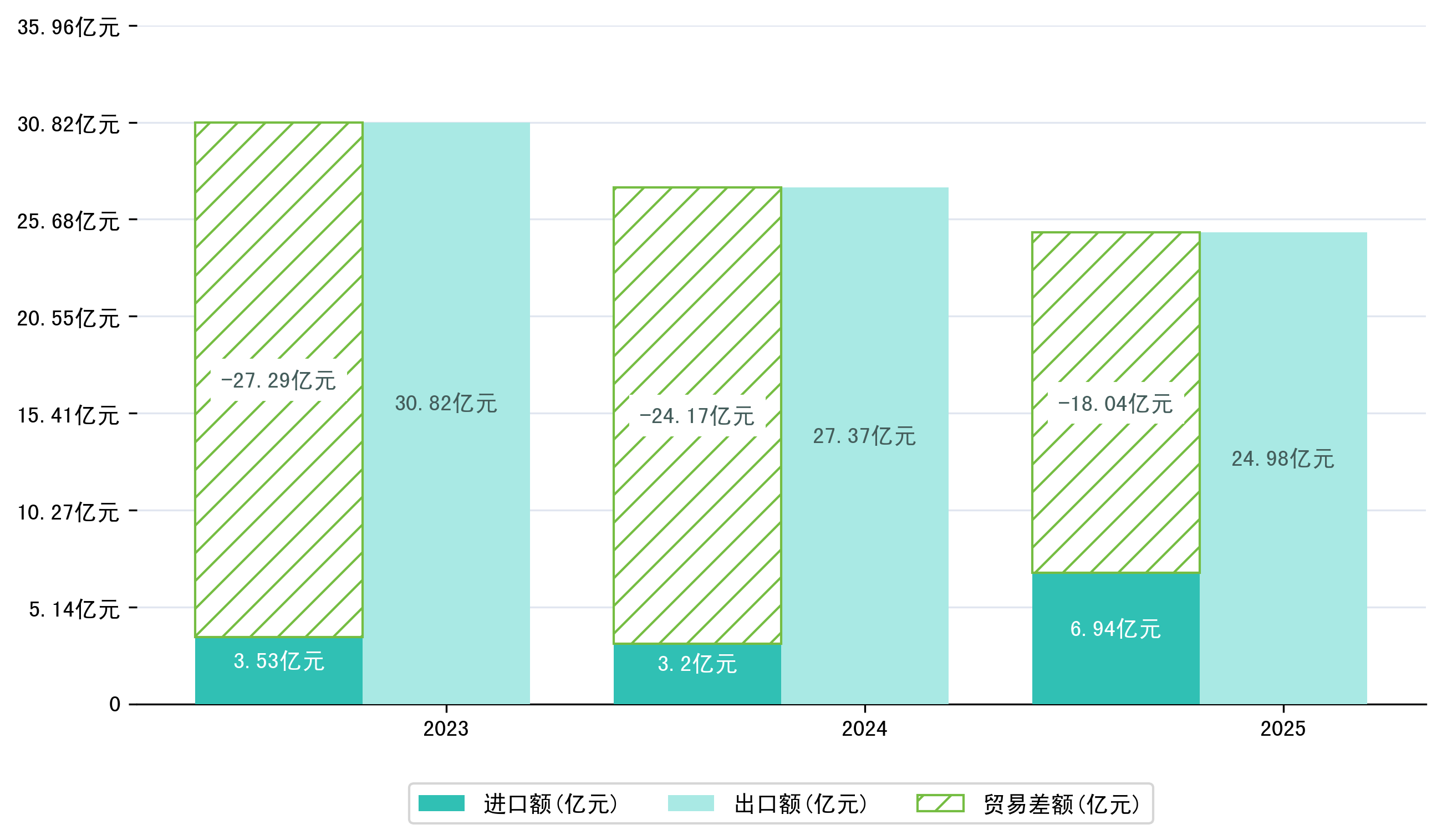 以人民币计,2025年1-10月大同市贸易差额为18,0364,8828万元(贸易顺差),相比上年同期减少了6,1308,4493万元,同比减少-25.37%。