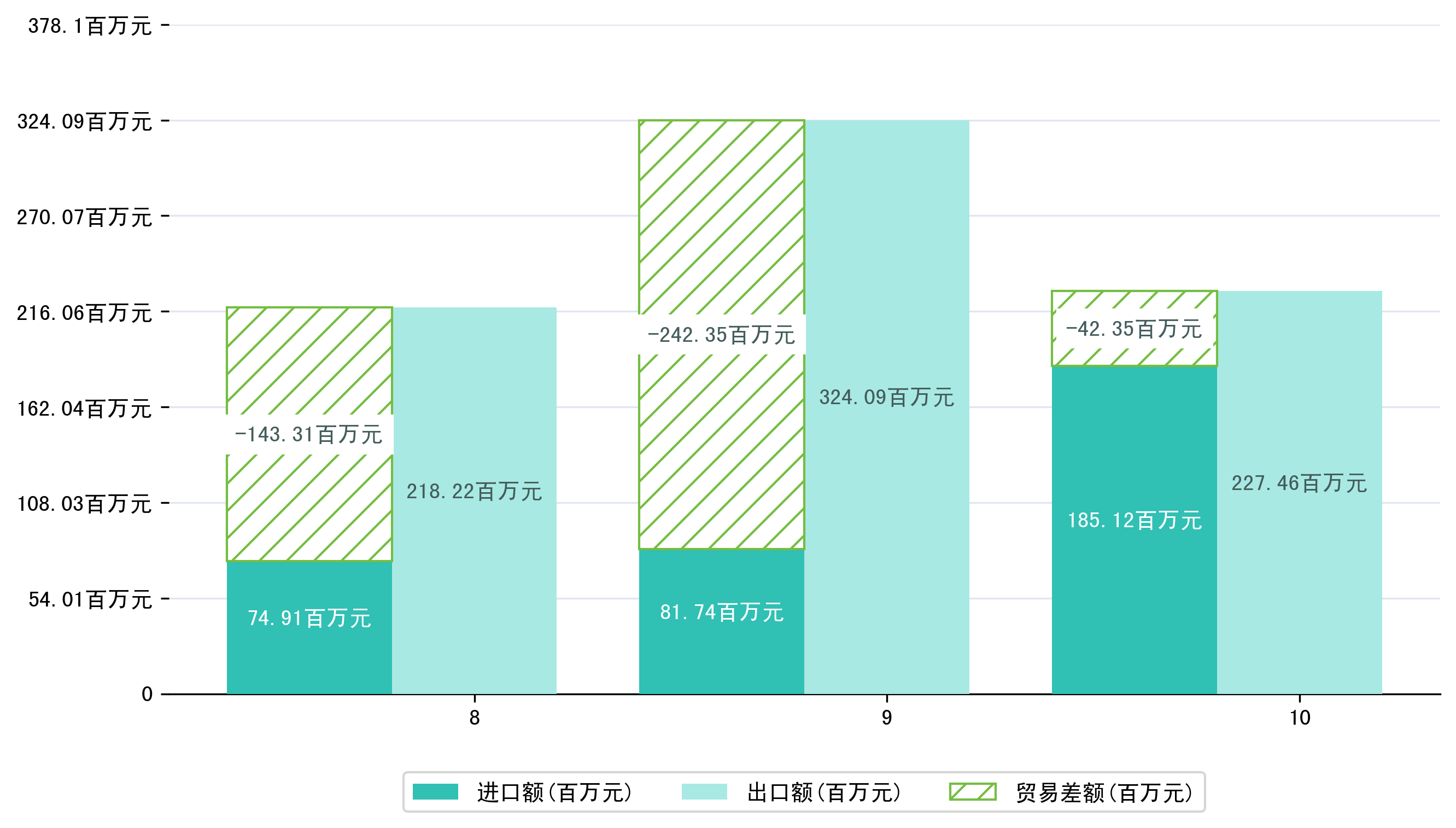 以人民币计,2025年10月大同市贸易差额为4234,6830万元(贸易顺差),相比上月减少了1,9999,9374万元,即2796,5470万美元;相比上年同期减少了1,9835,7947万元,同比减少-82.41%。