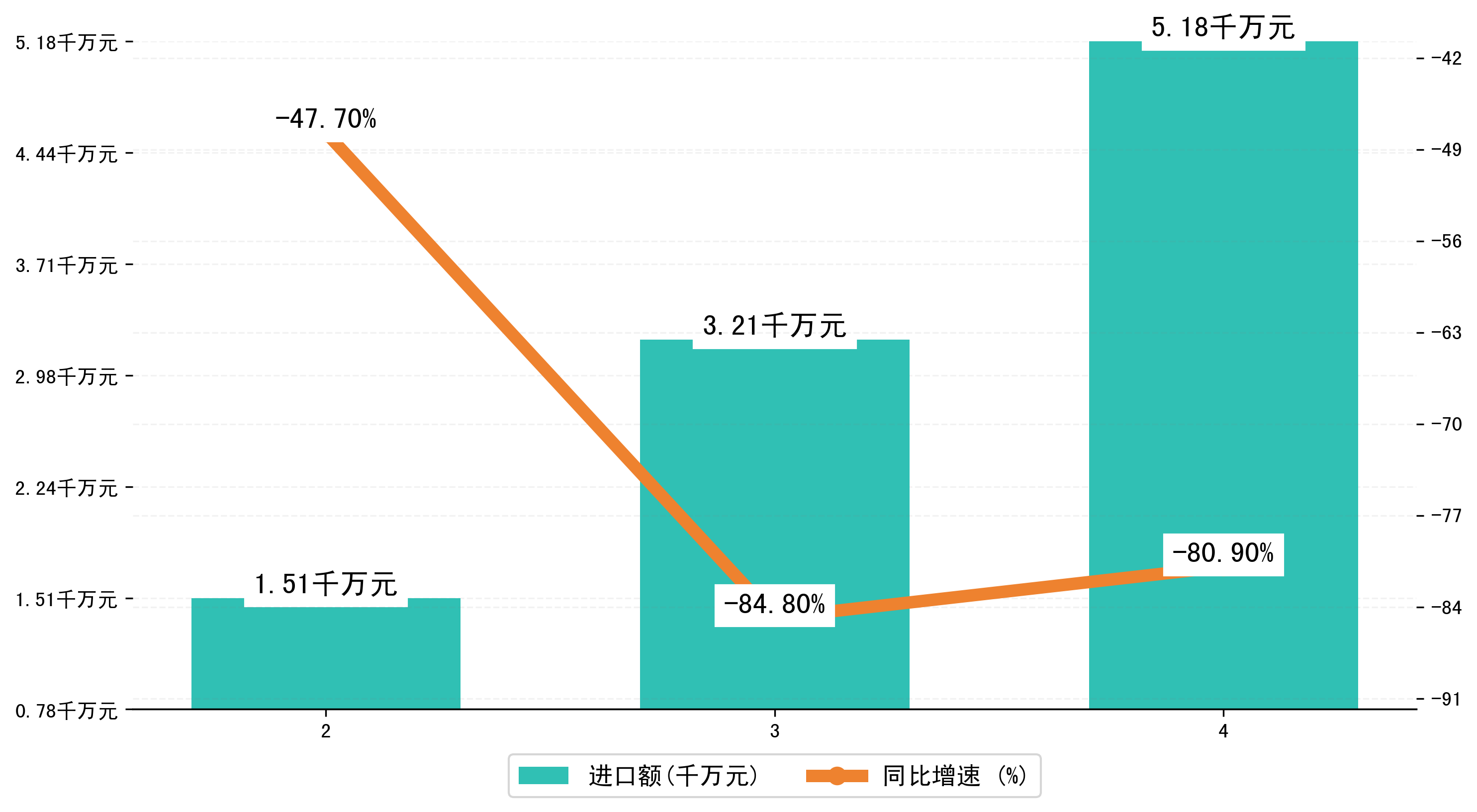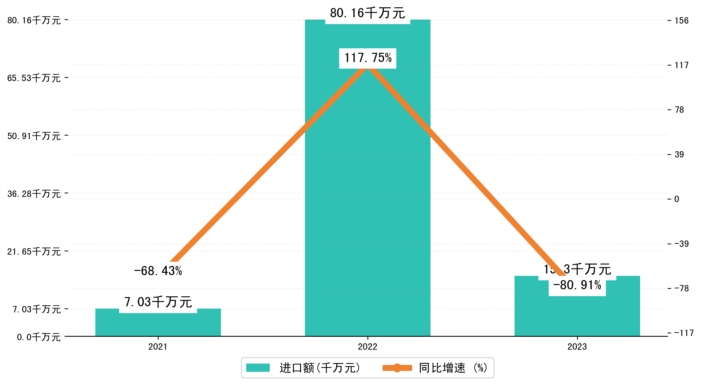 以人民币计,2023年1-4月大同市进口额为1,5301.4098万元,相比上年同期减少了6,4858.8261万元,同比减少了-80.90%。