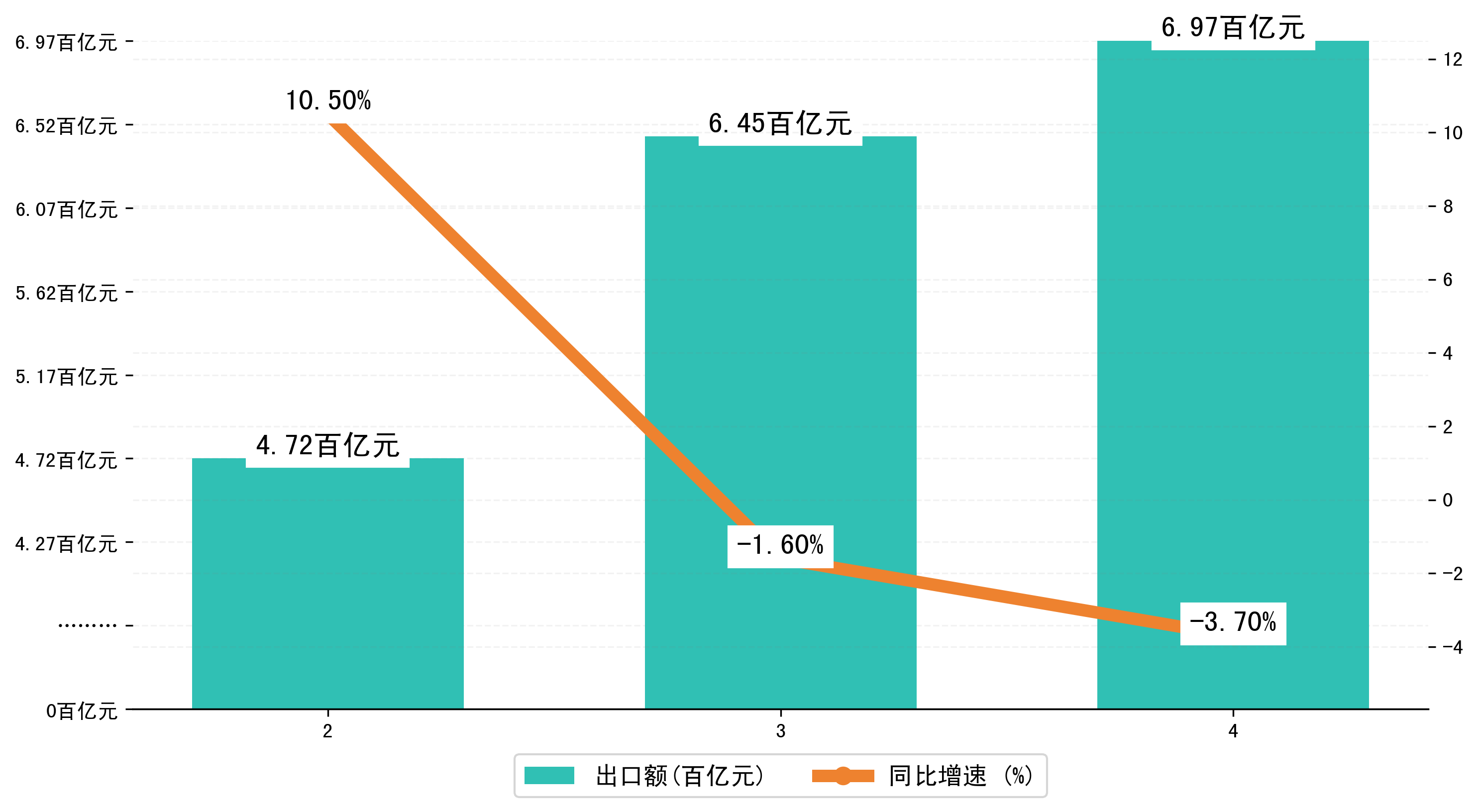 以美元计,2024年1-4月东莞市出口额为358,7001.2467万美元,相比上年同期减少了28,2863.979万美元,同比减少-7.00%。