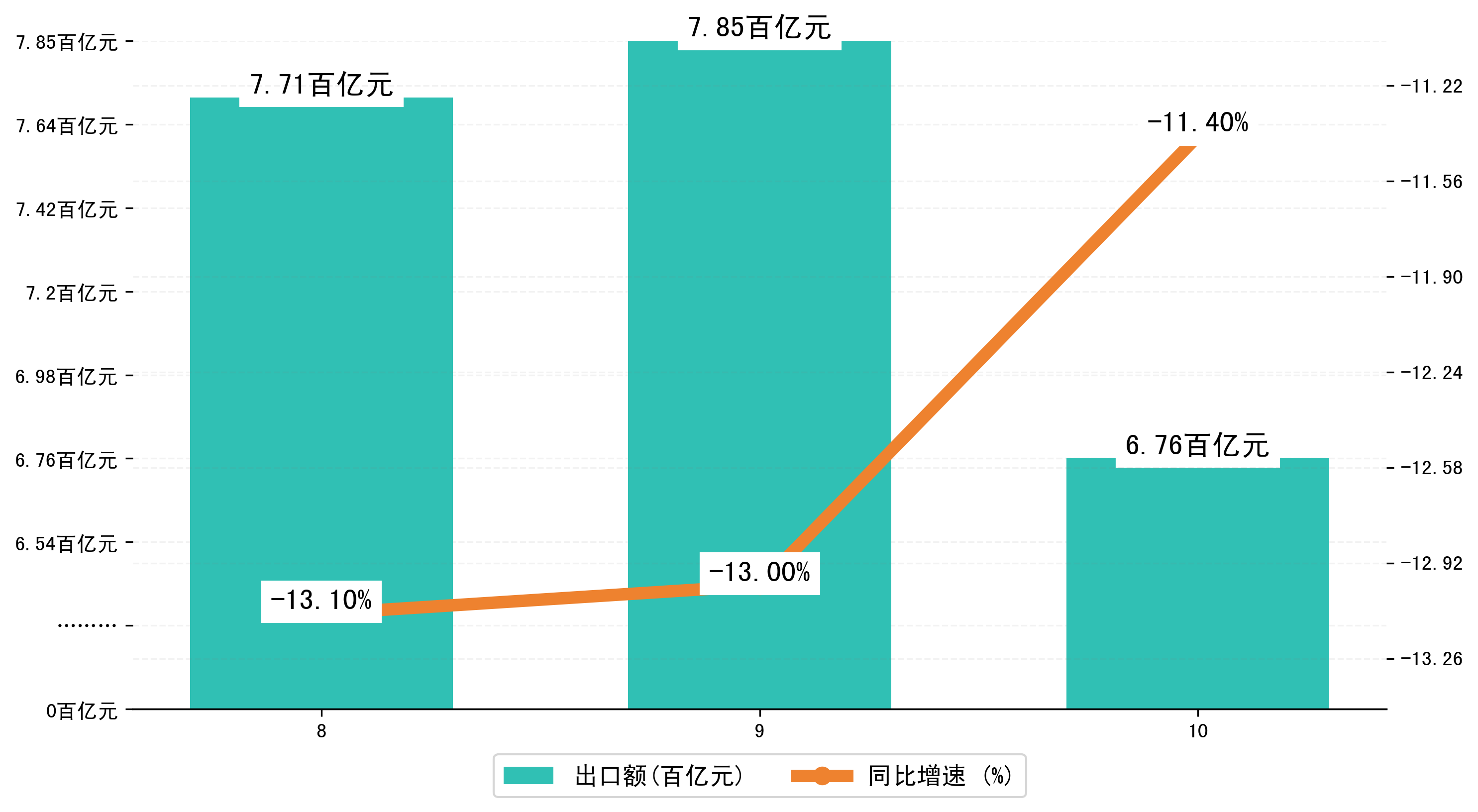 以人民币计,2023年10月东莞市出口额为675,8287.5462万元,相比上月减少了109,6429.5794万元;相比上年同期增加了55,2098.4081万元,同比减少了-11.40%。