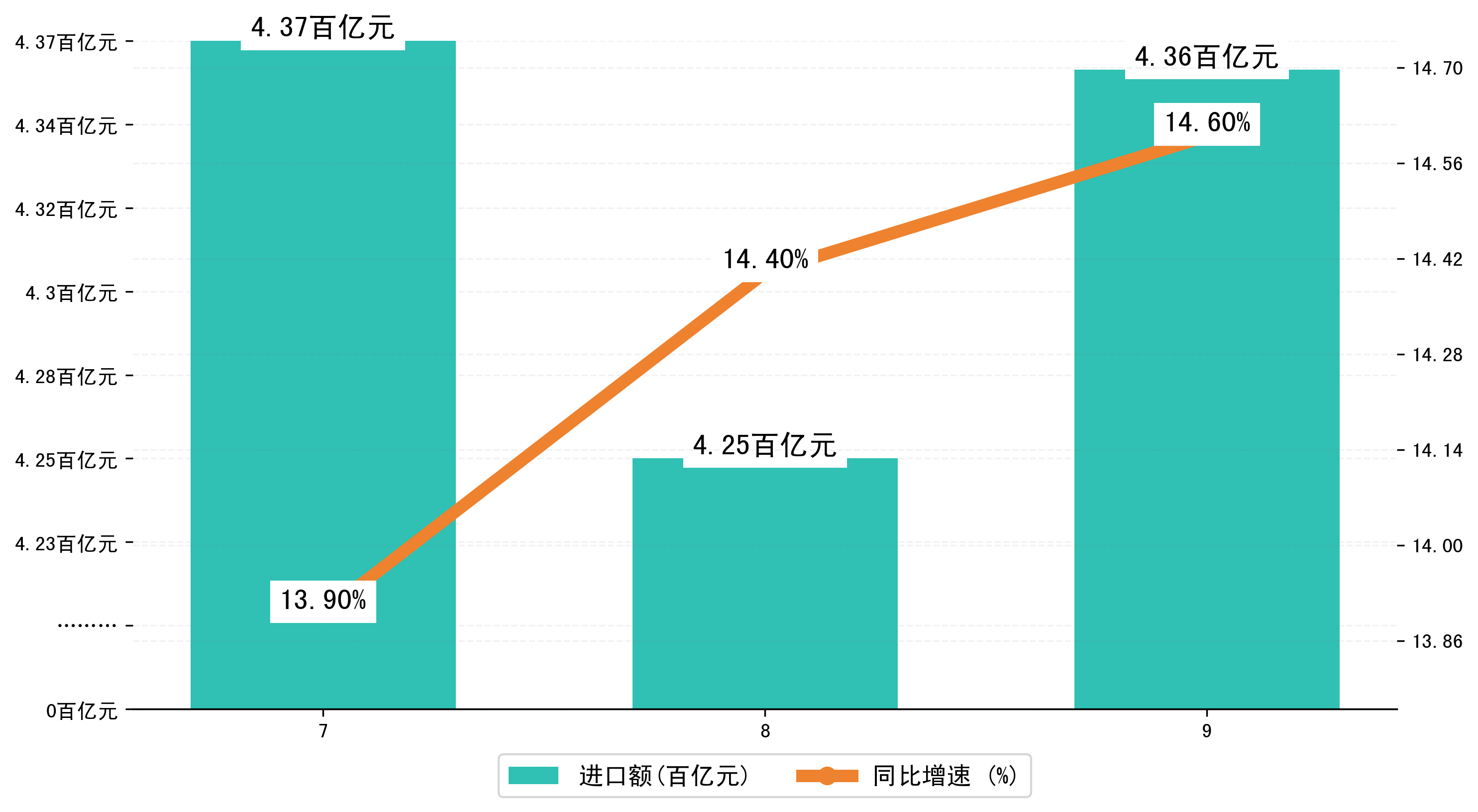 以人民币计,2024年9月东莞市进口额为435,9499.4146万元,相比上月增加了10,7426.0469万元;相比上年同期增加了59,4087.561万元,同比增加了14.60%。
